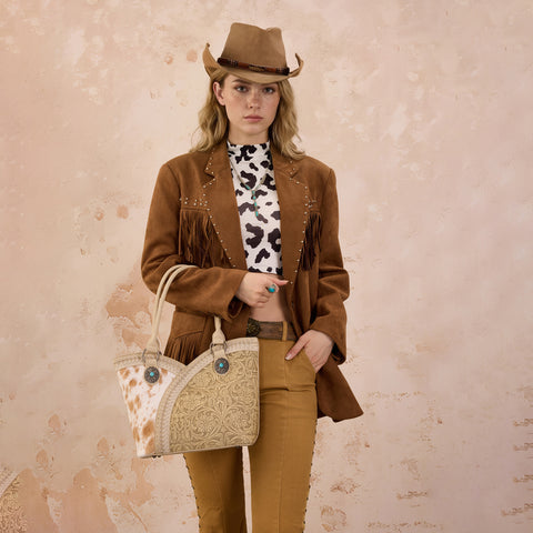 Make a bold Western statement with this beautifully detailed tote. Featuring a striking combination of genuine hair-on cowhide and intricately embossed floral tooling, this bag blends rustic charm with feminine...