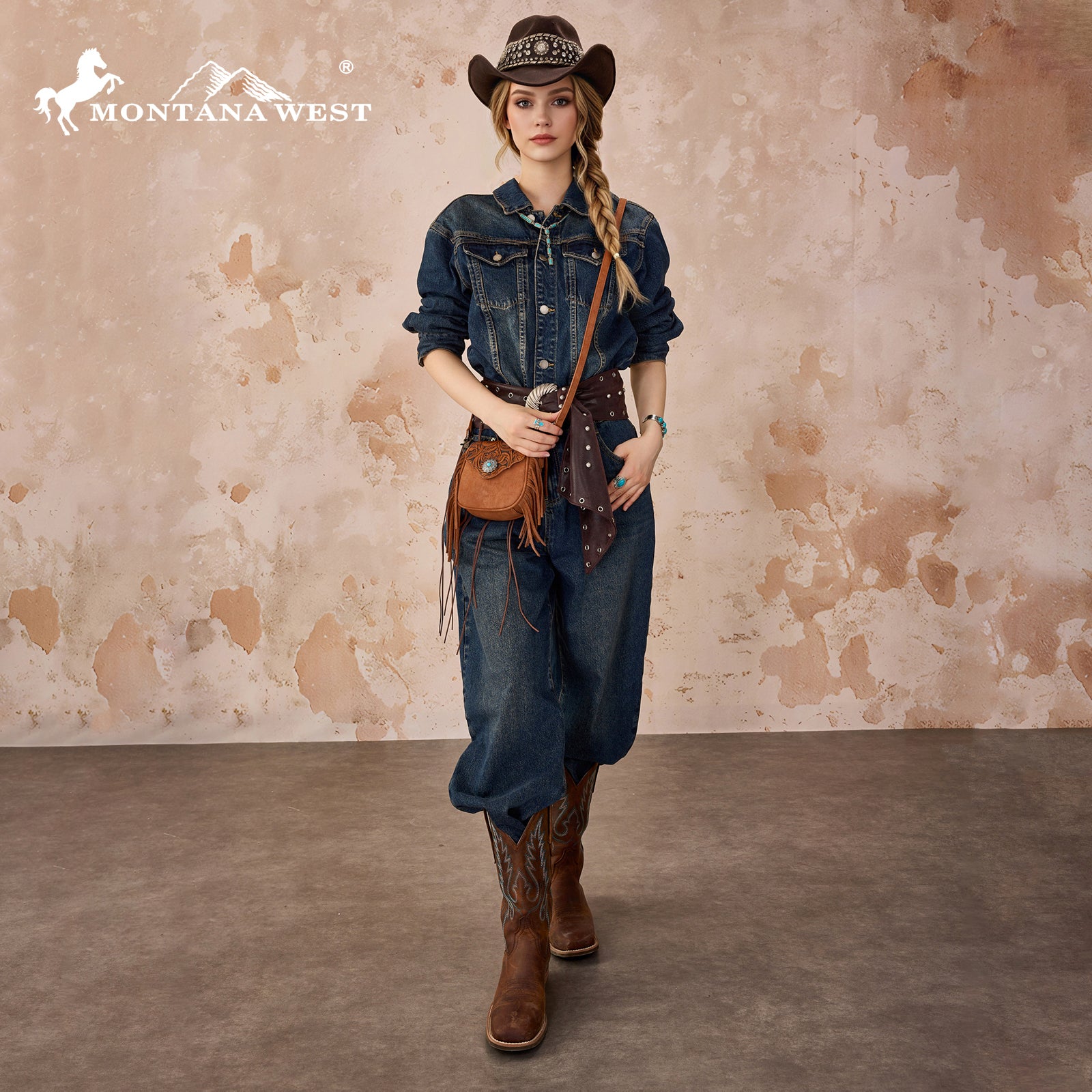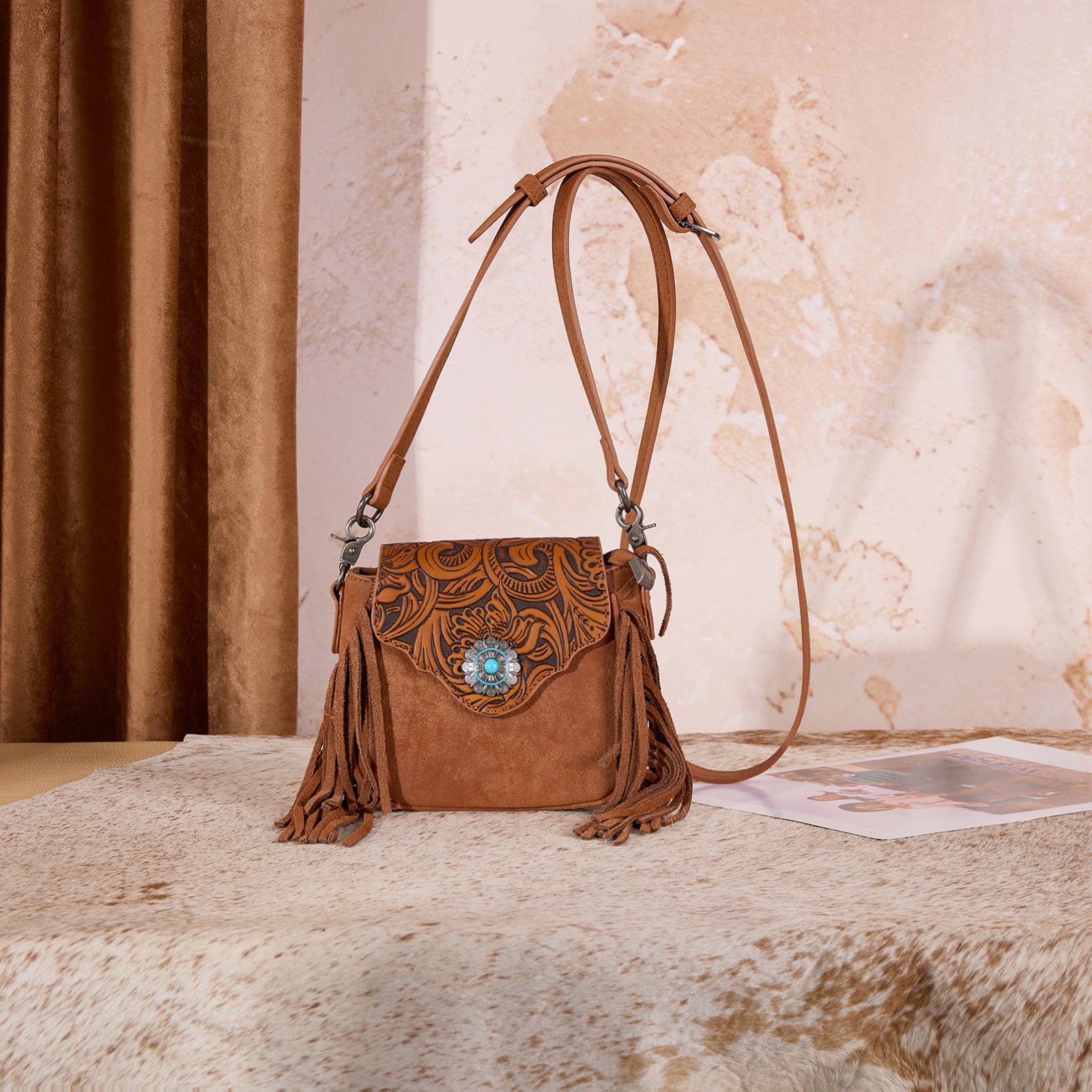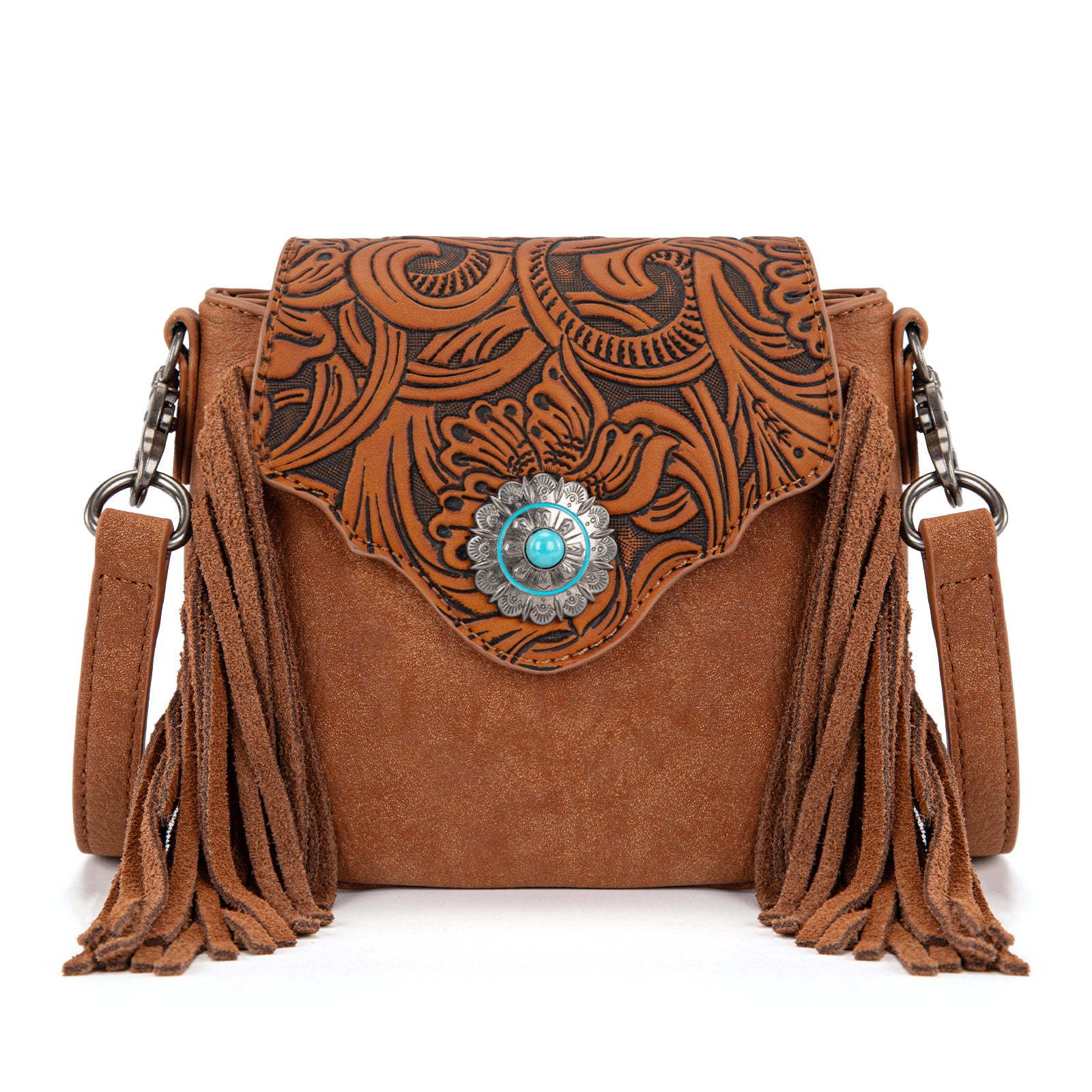 Add a touch of Western charm to your everyday style with this stunning Montana West mini crossbody bag.  This compact bag features an intricately embossed floral flap and a striking concho accent with a turquoise stone centerpiece. Fringe detailing on both sides gives it that perfect boho-Western flair.
