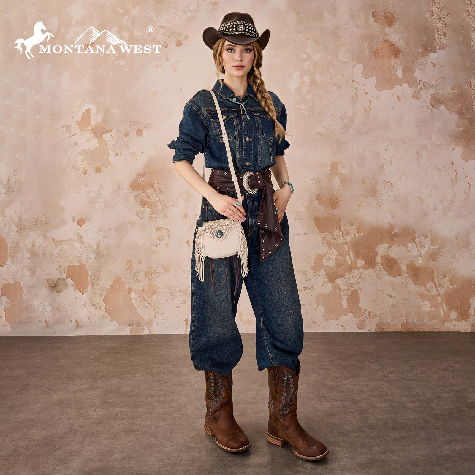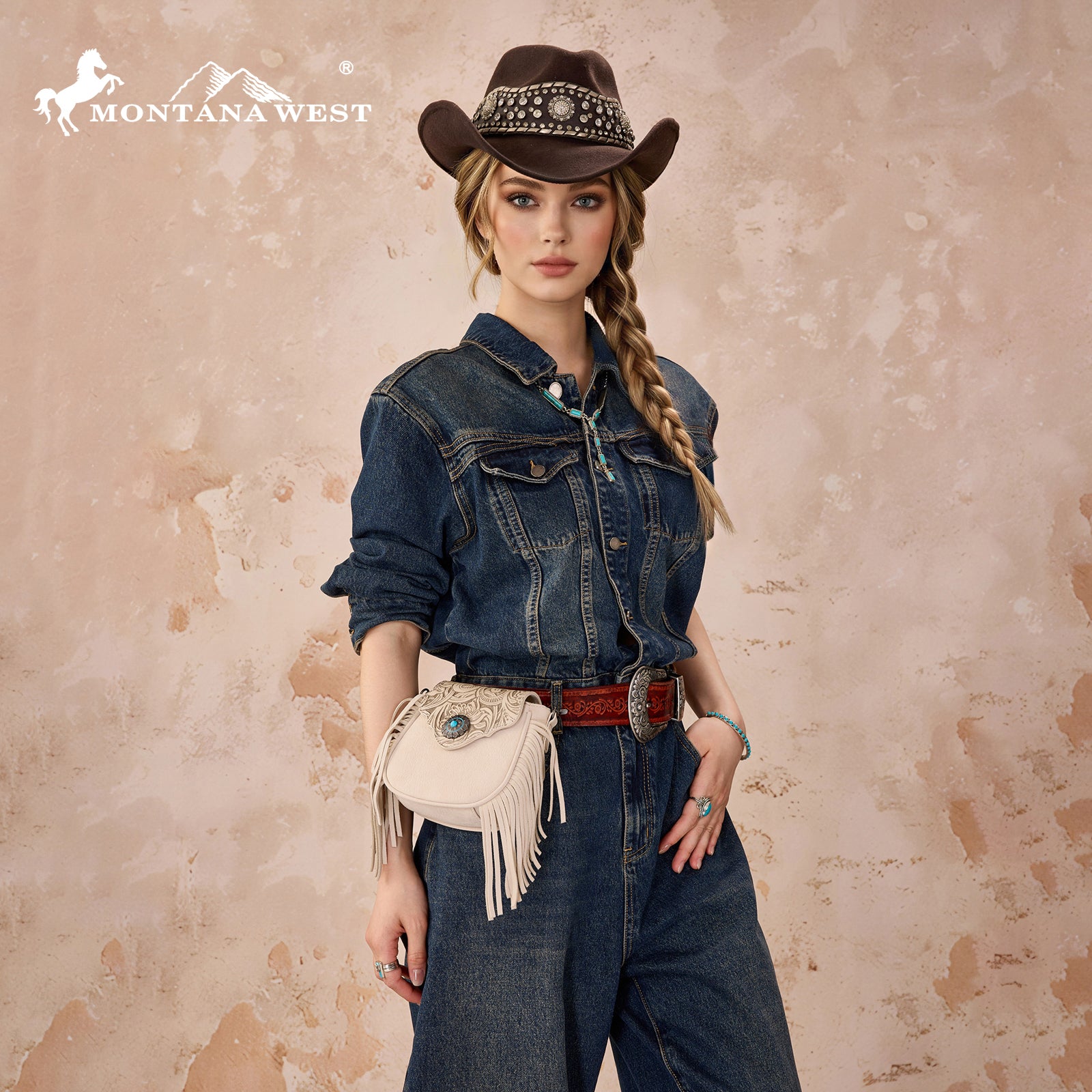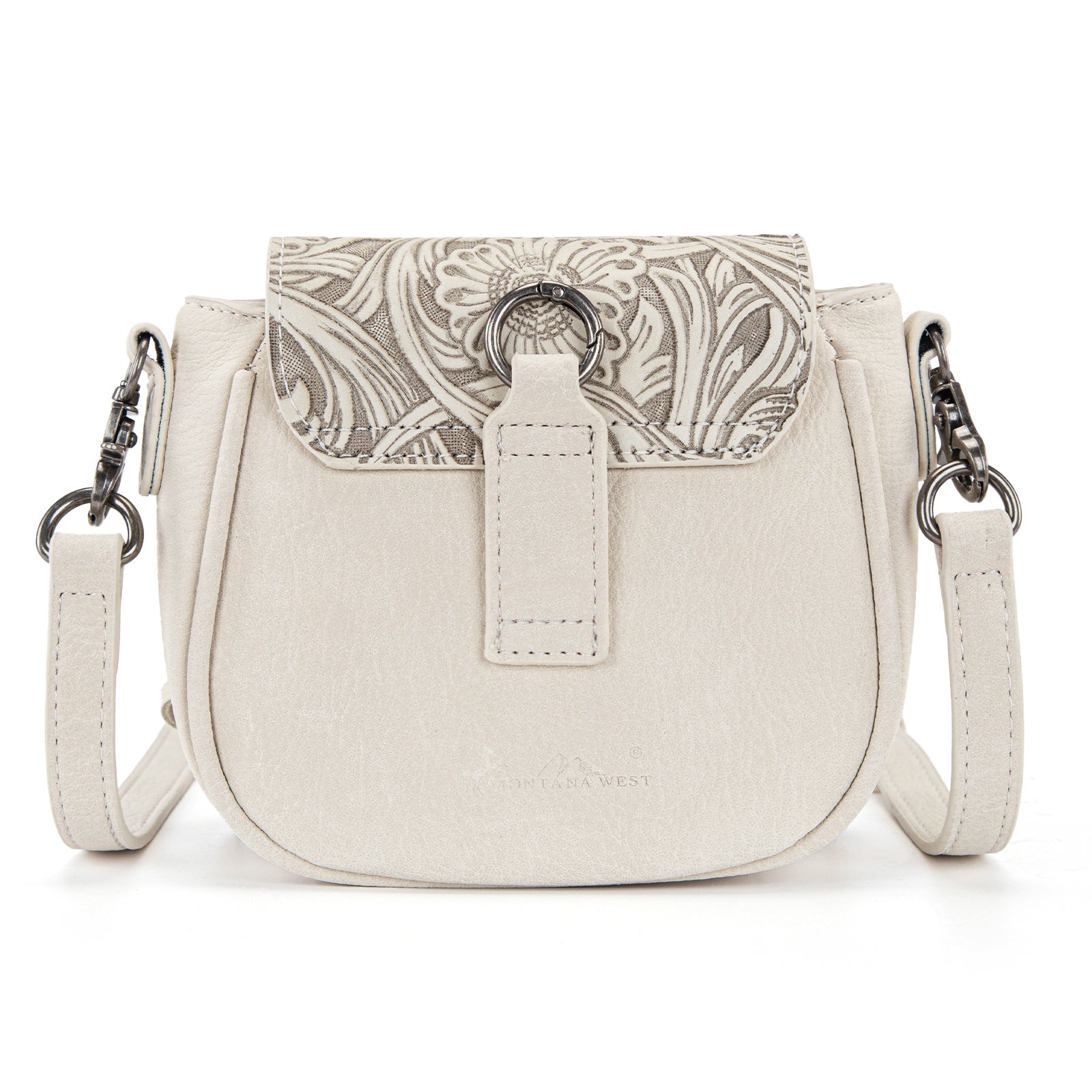 SKU:MW1366-8360TNAdd a touch of Western charm to your everyday style with this stunning Montana West mini crossbody bag. This compact bag features an intricately embossed floral flap and a striking concho accent with a turquoise stone centerpiece. Fringe detailing on both sides gives it that perfect boho-Western flair.