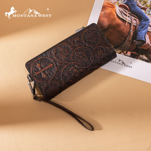 MWL-4206 Montana West Genuine Leather Tooled Bi-Fold Wallet with Detachable Zippered Pocket