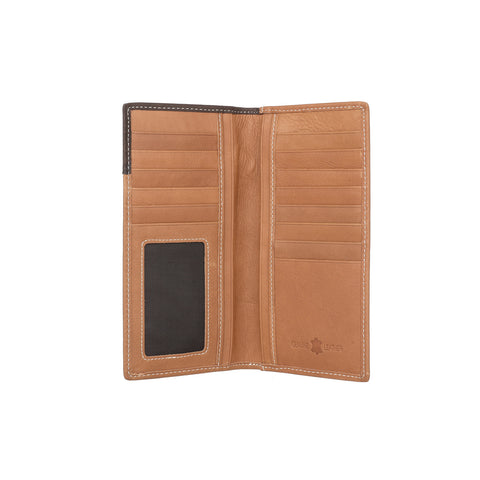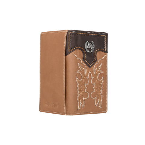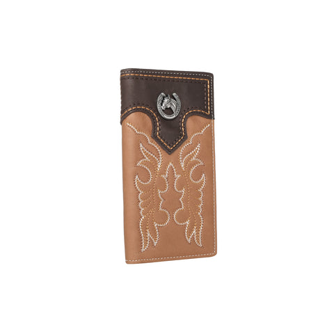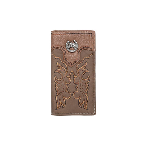 Made of genuine leather, this bi-fold wallet has: Embroidered boot scroll pattern Accented with antique silver horse concho An open pocket on the back 1 clear ID slot, 13 card slots...