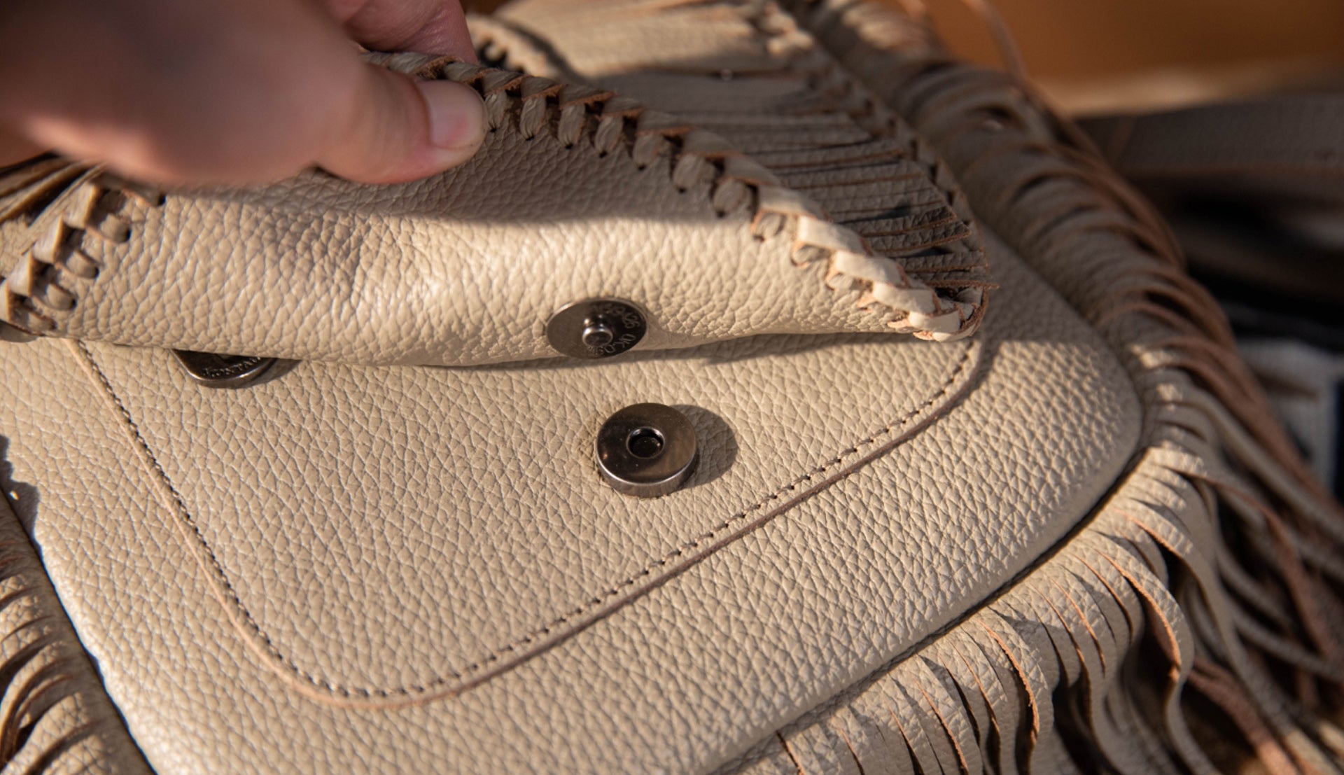 • Genuine hair-on cowhide and braided details on the flap with magnetic button closure