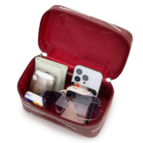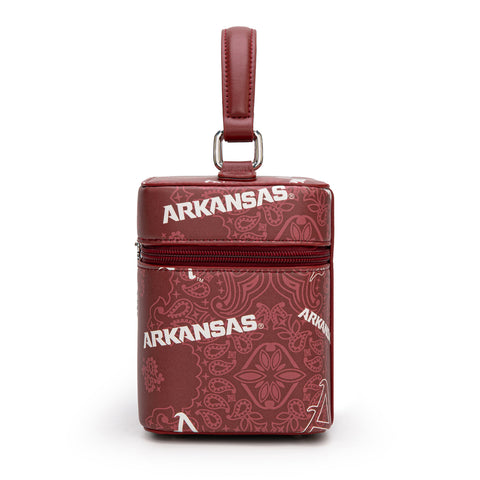 Made of PU Leather, this vanity bag has: Embroidered Razorbacks on the front "Arkansas" logo paisley print Top handle (Drop 3") Zipper closure Inside of the bag includes a...