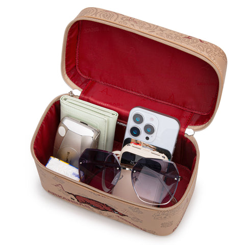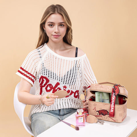 Made of PU Leather, this vanity bag has: Embroidered Razorbacks on the front "Arkansas" logo paisley print Top handle (Drop 3") Zipper closure Inside of the bag includes a...