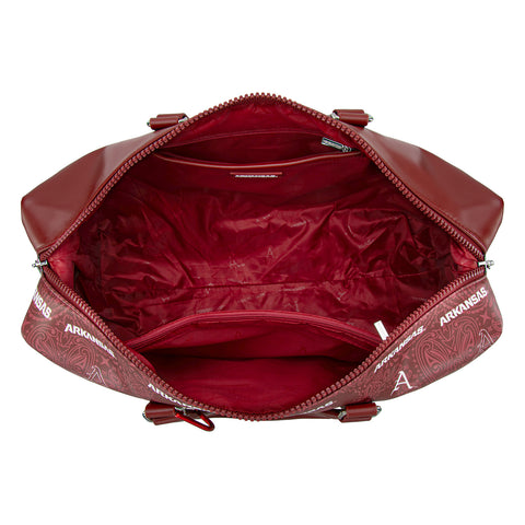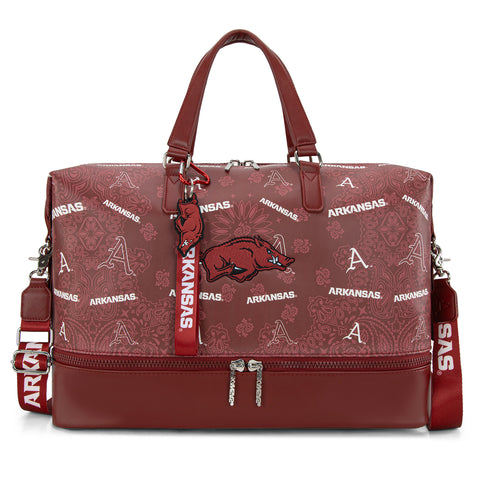 Versatile for Travel and Gym Made of PU Leather, this duffle bag has: Embroidered Razorbacks on the front "Arkansas" logo paisley print Double handle Zipper closure Inside of the...