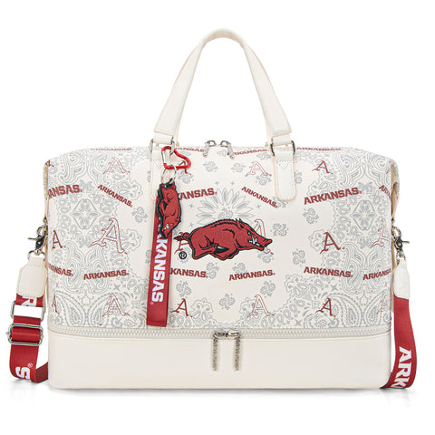 Versatile for Travel and Gym Made of PU Leather, this duffle bag has: Embroidered Razorbacks on the front "Arkansas" logo paisley print Double handle Zipper closure Inside of the...