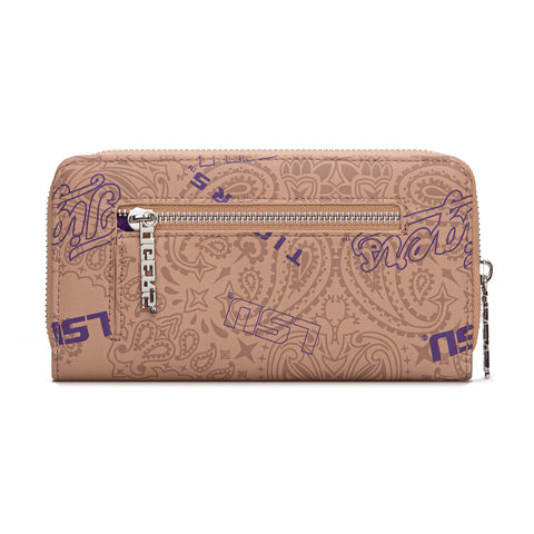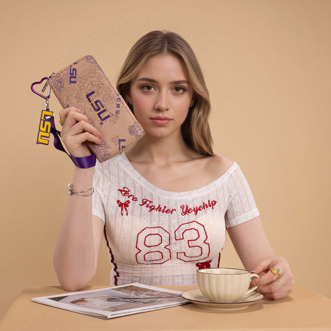 Made of PU Leather and polyester lining, this wallet has: Embroidered LSU logo on the front "LSU" Tigers logo paisley print Zipper closure 3 open compartment, a zipper pocket and 10...