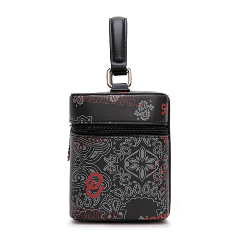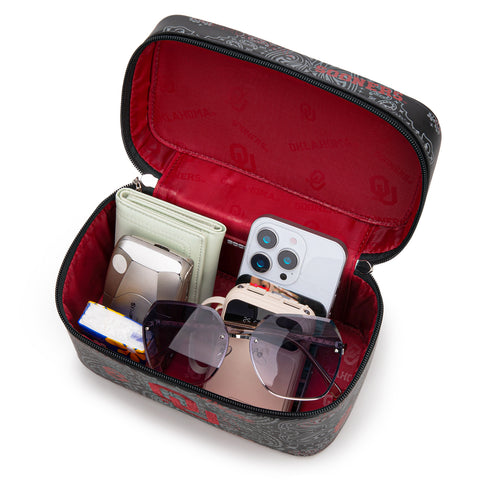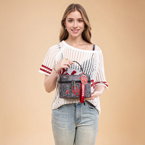 Made of PU Leather, this vanity bag has: Embroidered OU logo on the front "Oklahoma" logo paisley print Top handle (Drop 3") Zipper closure Inside of the bag includes a...