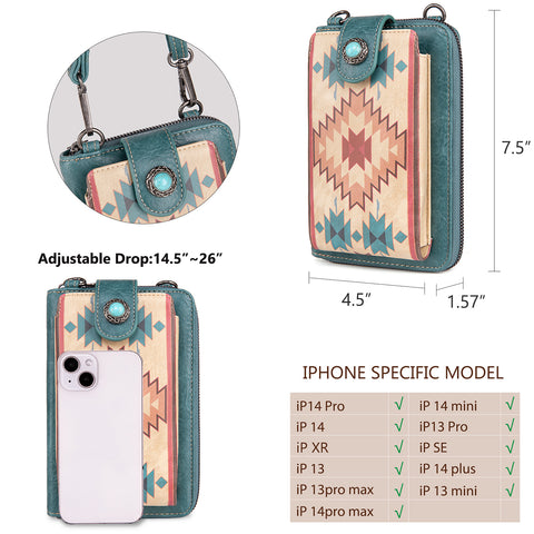 Western design smartphone wallet . Excellent everyday wallet and perfect vacation wallet. Made of PU leather, this western Phone wallet/crossbody has: Aztec print pattern on theĀ front pocket Turquoise stone...