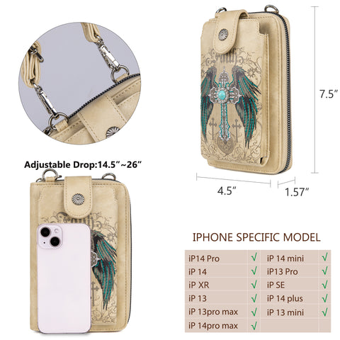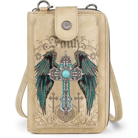 Western design smartphone wallet . Excellent everyday wallet and perfect vacation wallet. Made of PU leather, this western Phone wallet/crossbody has: Wing Cross "FAITH" on theĀ front pocket Antique silver...