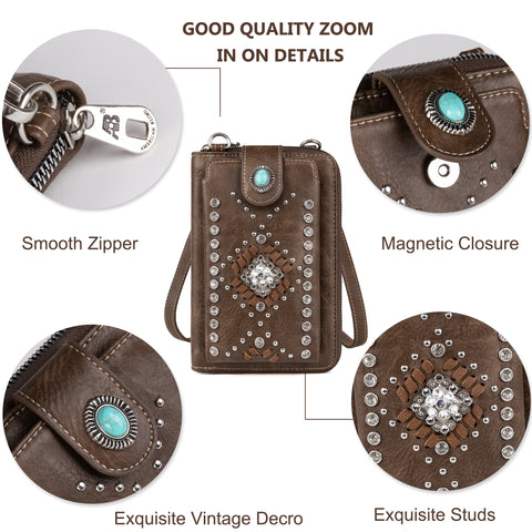 Western design smartphone wallet . Excellent everyday wallet and perfect vacation wallet. Made of PU leather, this western Phone wallet/crossbody has: Crystal studs and diamond shape concho on the front...