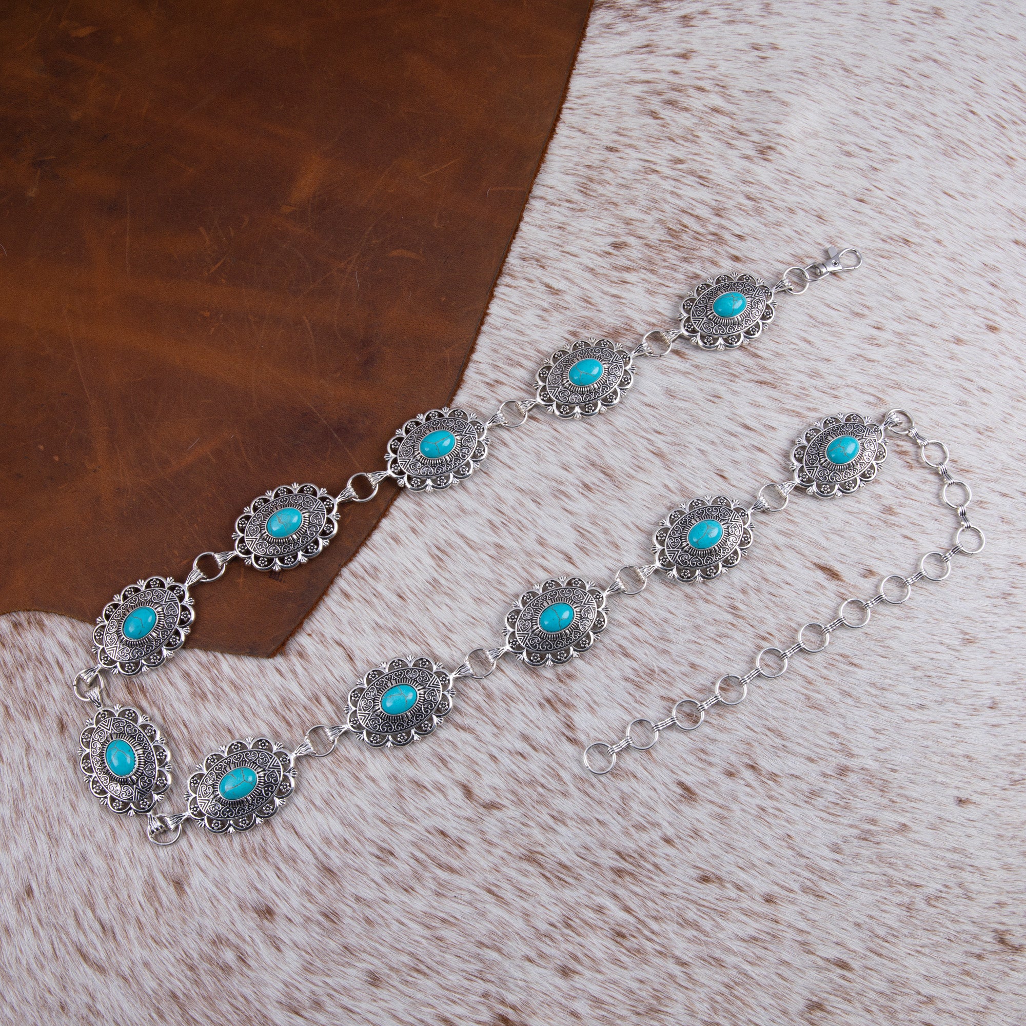 RCB-1026 Rustic Couture Oval Flower Stone Concho and daisy conchos Link Chain Belt