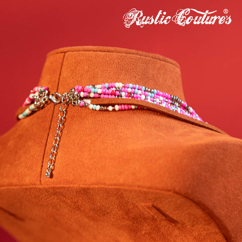 RNS-1023 Rustic Couture's Turquoise Beaded Leather Layered Necklace Western Charms Earrings Set