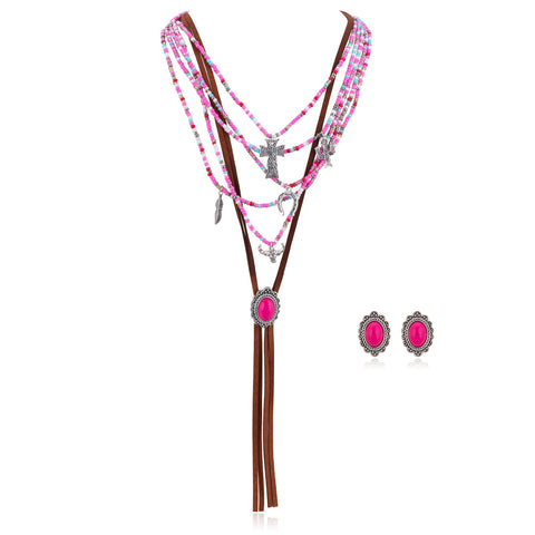 Layered Beaded Leather Necklace Western Charms , Silver Cross and Turquoise Stone Pendant with Earrings Set