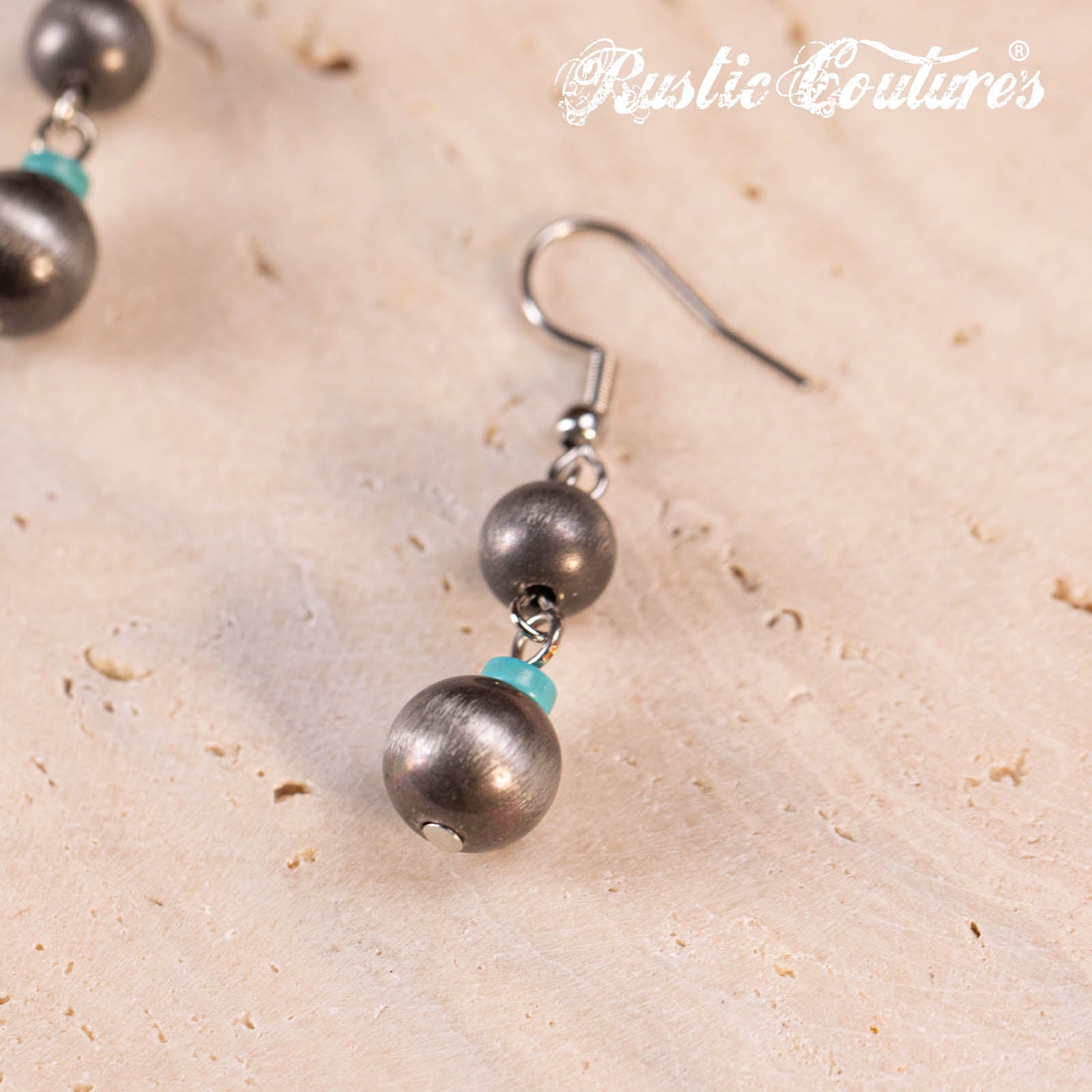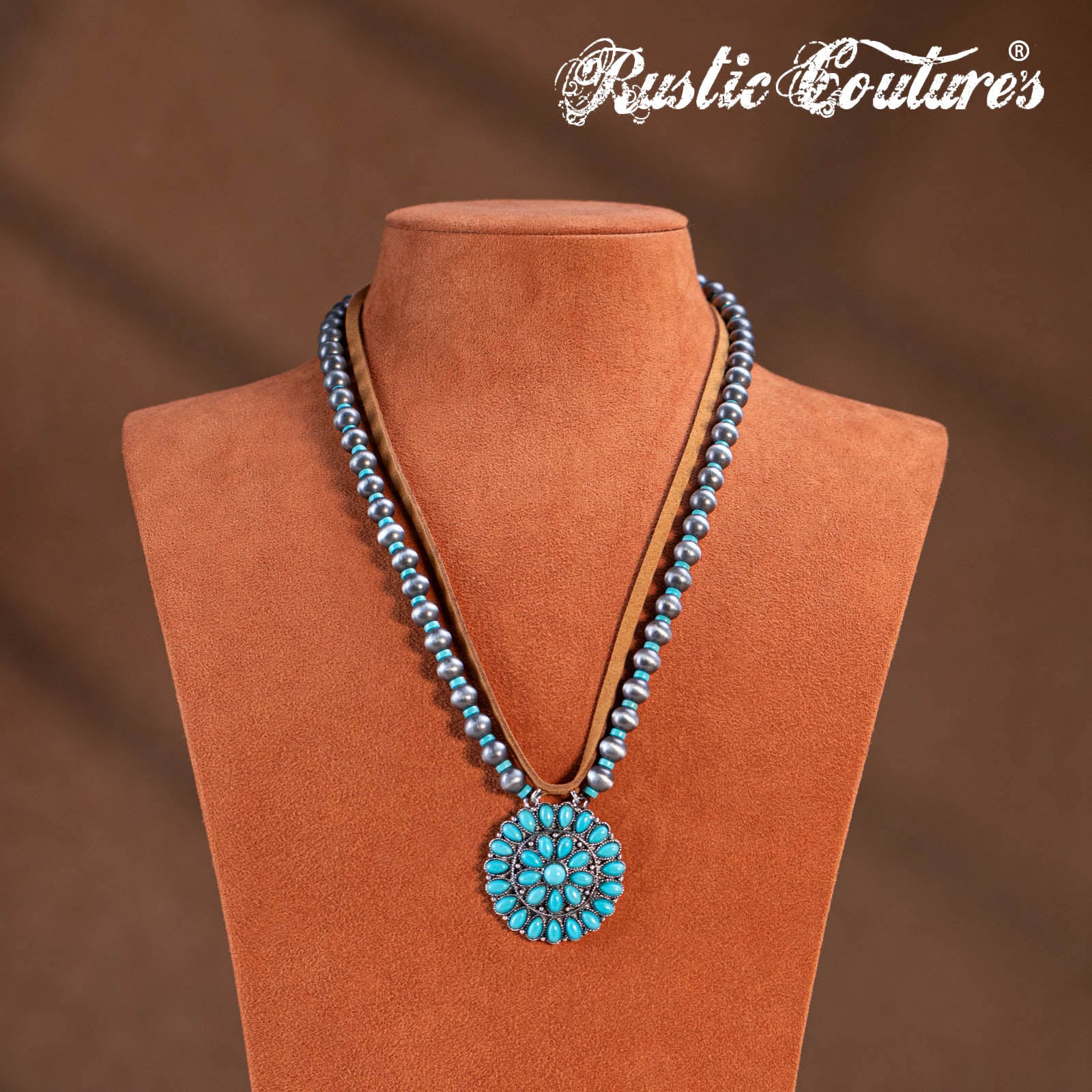RNS-1045 Rustic Couture's Layered Beaded Leather Necklace Turquoise Daisy Pendant Earring Set