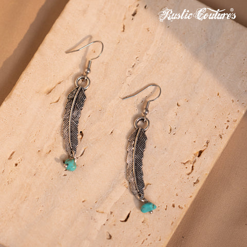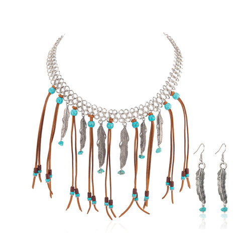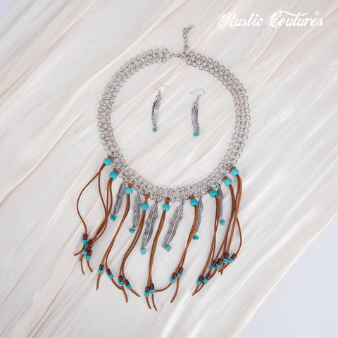 RNS-1049 Rustic Couture's Navajo Beaded Leather Tassels Feather Charms Necklace Earring Set