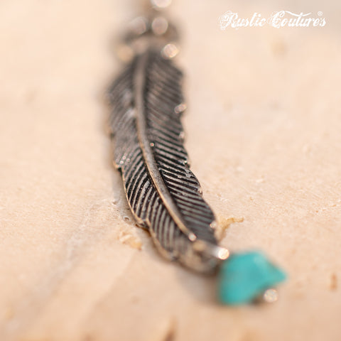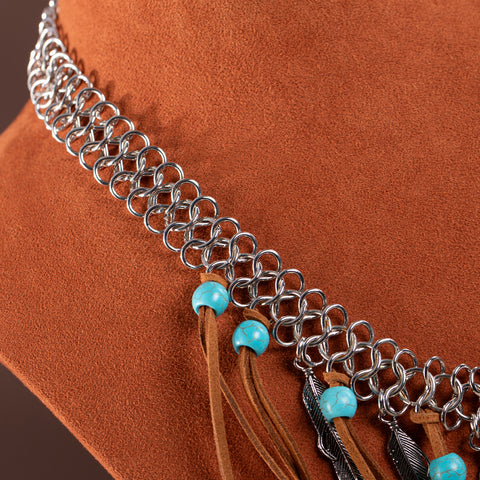 Design: Silver chain necklace , leather tassels turquoise beaded , feather charms