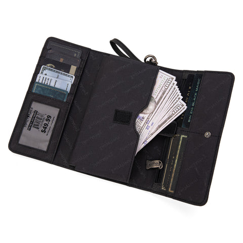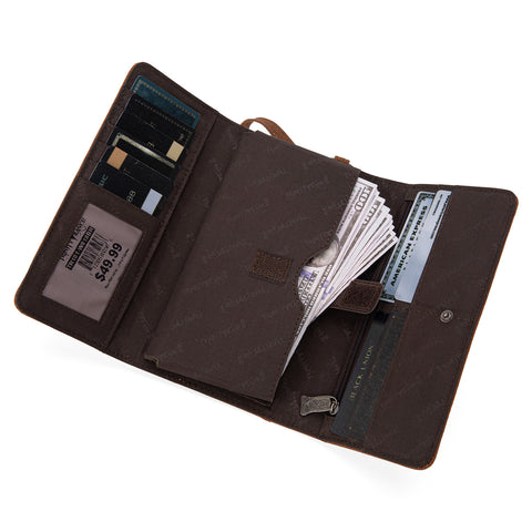 Made of PU leather, this wallet has: Floral tooled on genuine leather Accented with studs Antique buckle on the front Multiple card slots, 2 long slot compartments, zippered pocket, and...