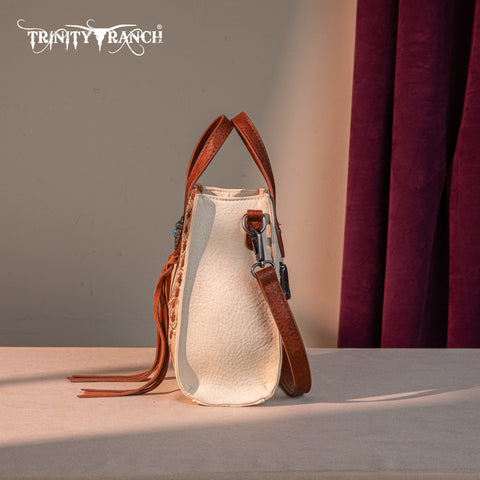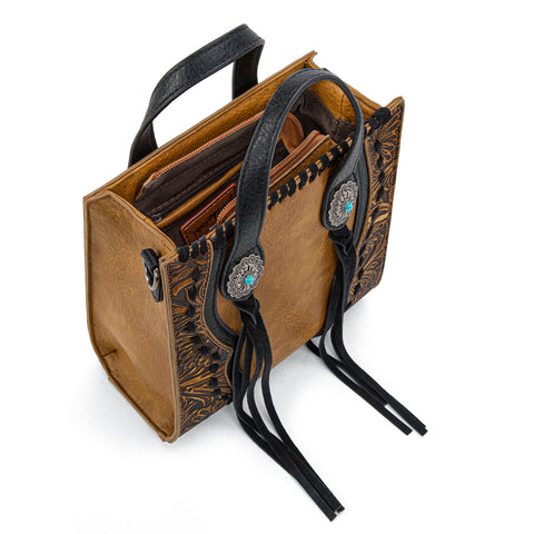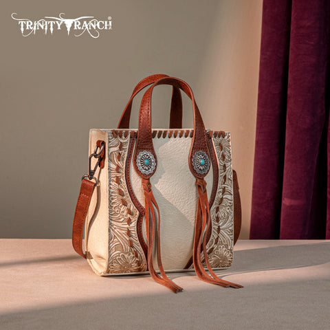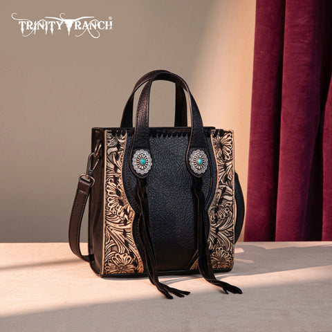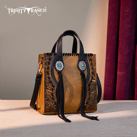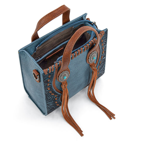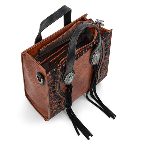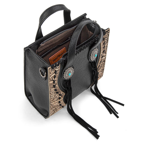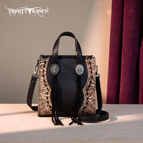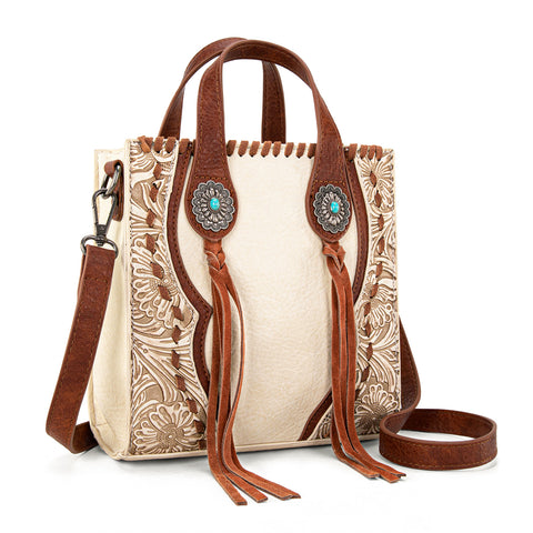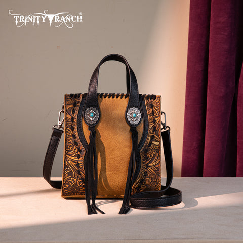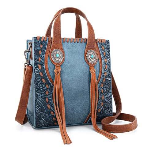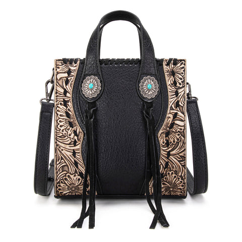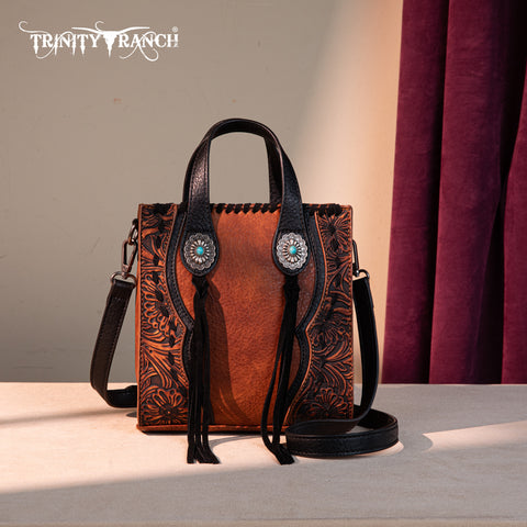 Trinity Ranch line by Montana West, this mini tote/crossbody has: Floral tooled pattern Whipstitch details Accent with antique silver turquoise stone concho Leather tassel on the front Top zipper closure...