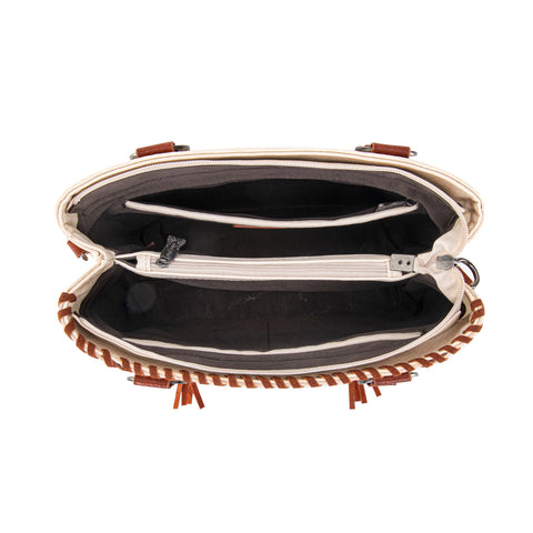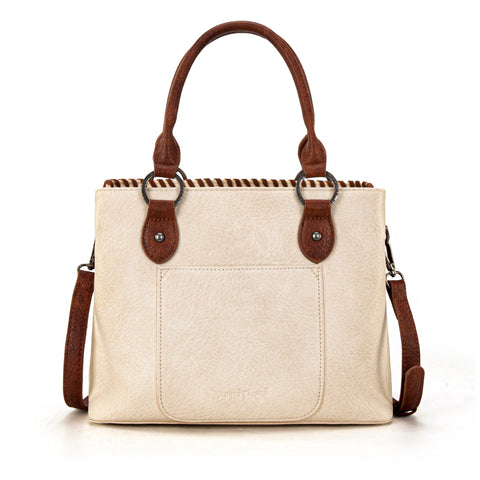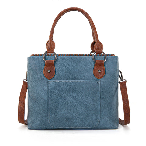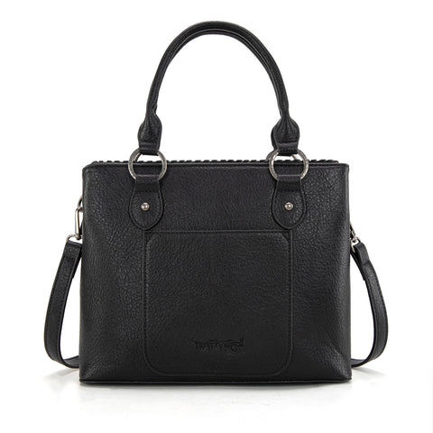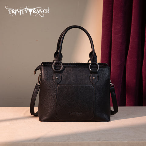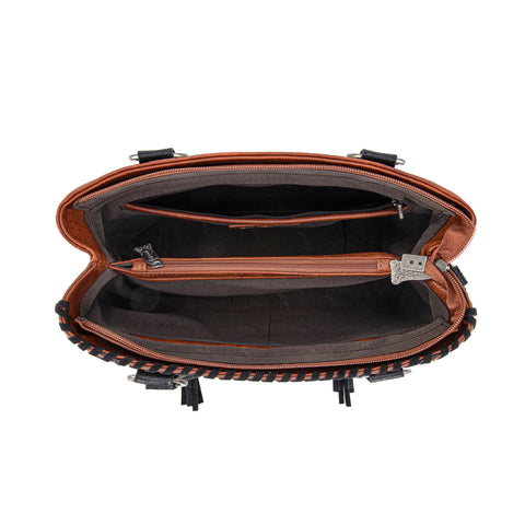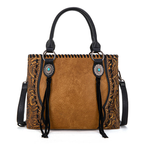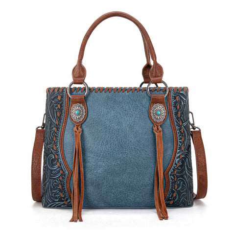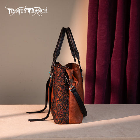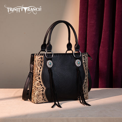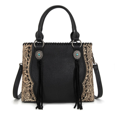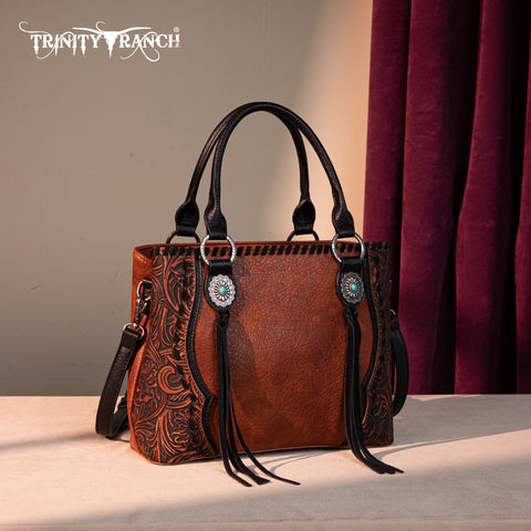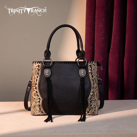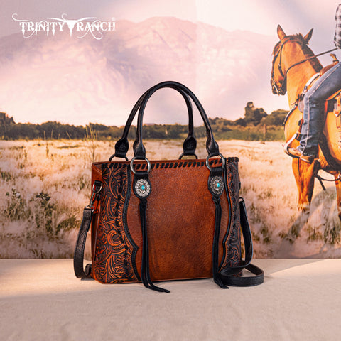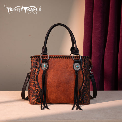 Trinity Ranch line by Montana West, this satchel/crossbody has: Floral tooled pattern Whipstitch details Accent with antique silver turquoise stone concho Leather tassel on the front Top zipper closure Inside...