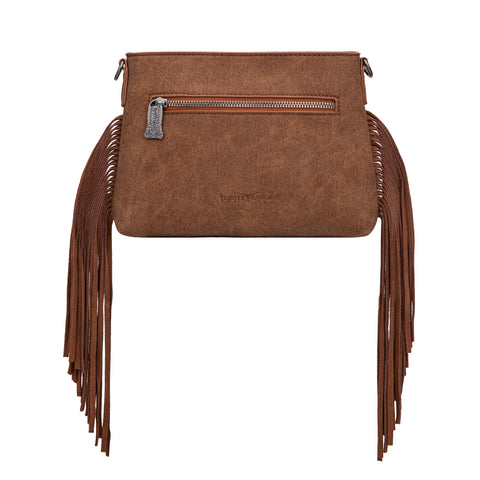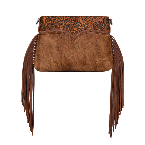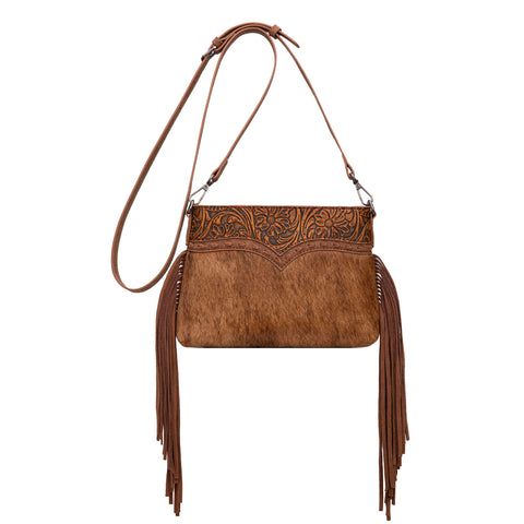 Trinity Ranch line by Montana West, this partial genuine leather crossbody has: Floral tooled on the front Genuine Hair-On Cowhide FringeĀ Saddle stitch and antique silver studs Top zipper closure...