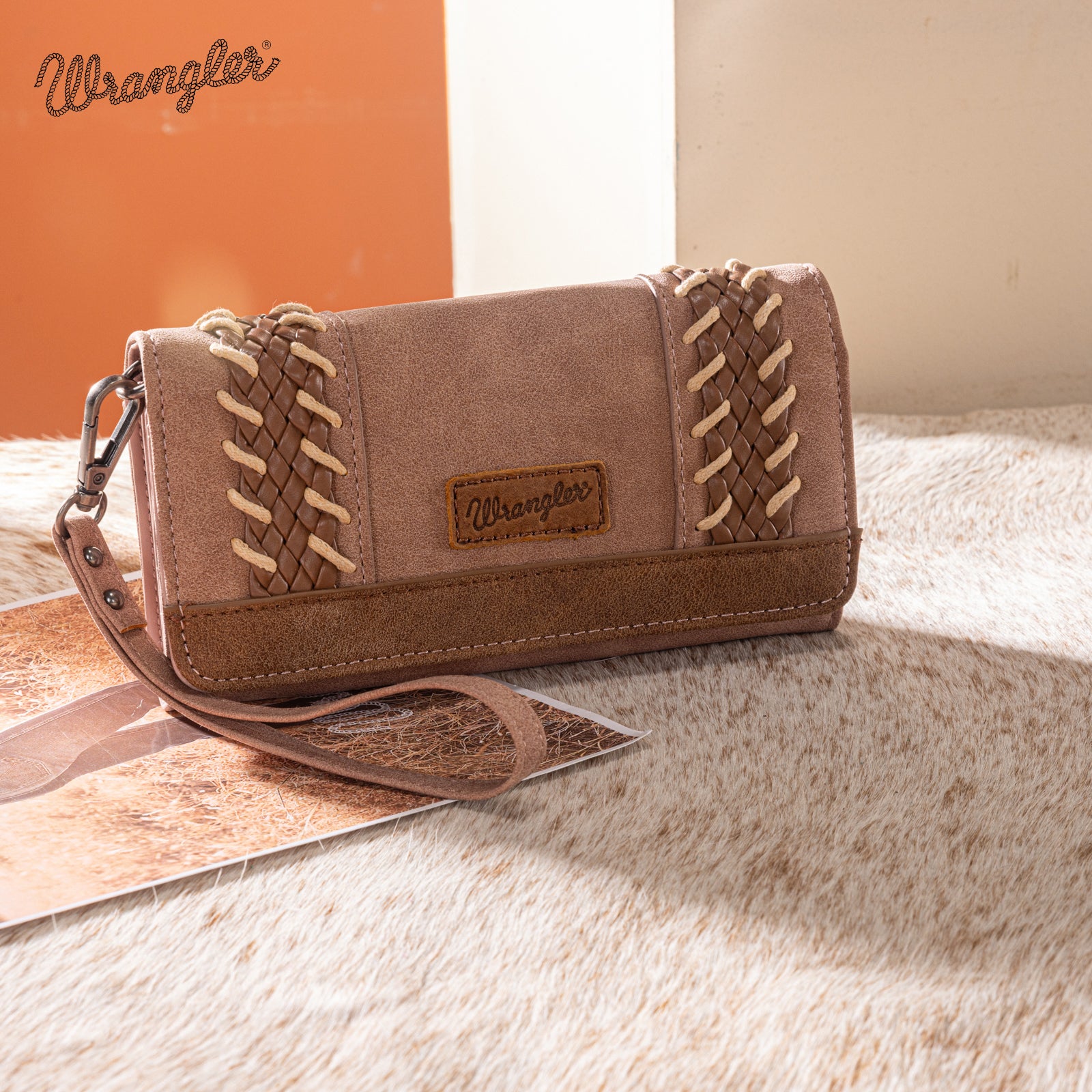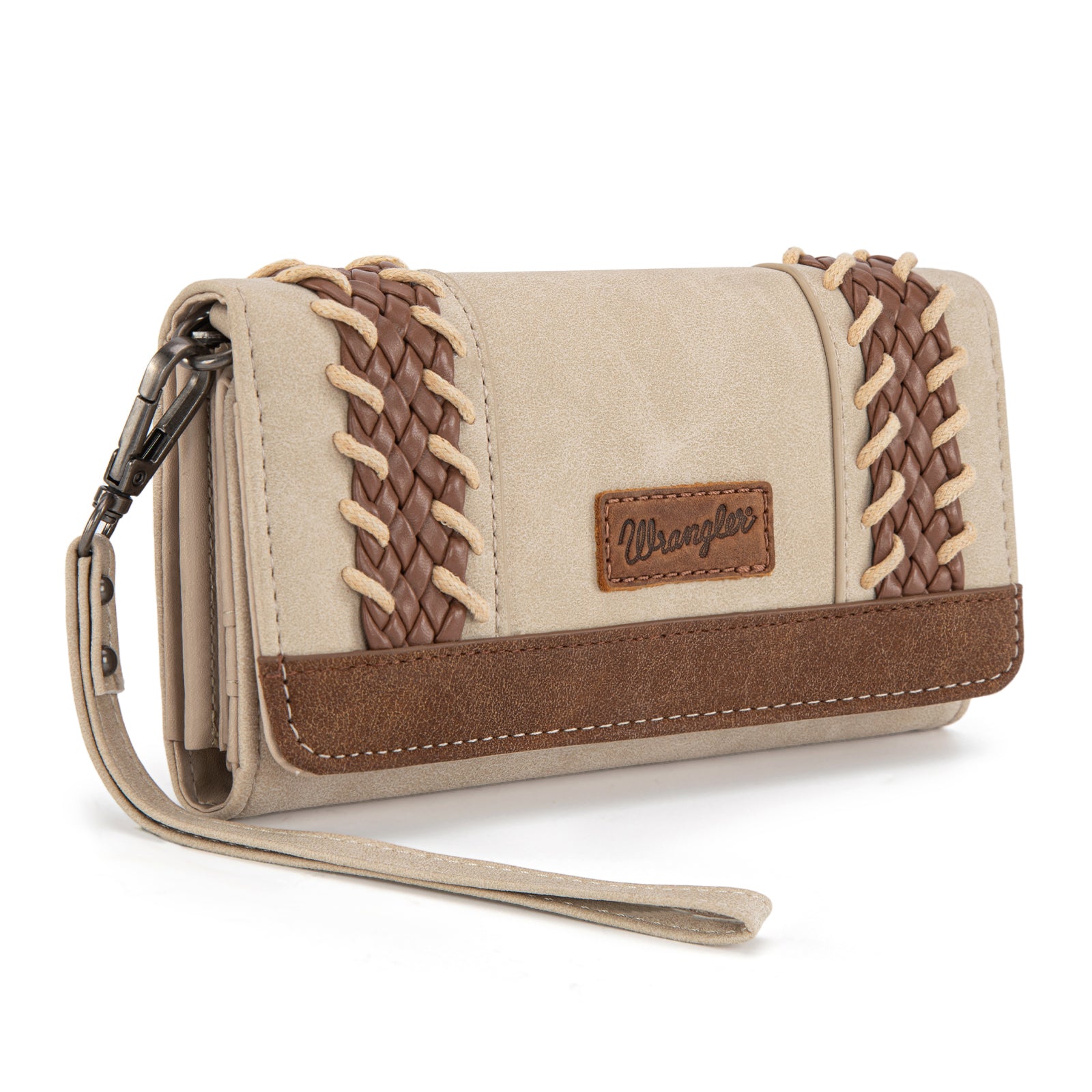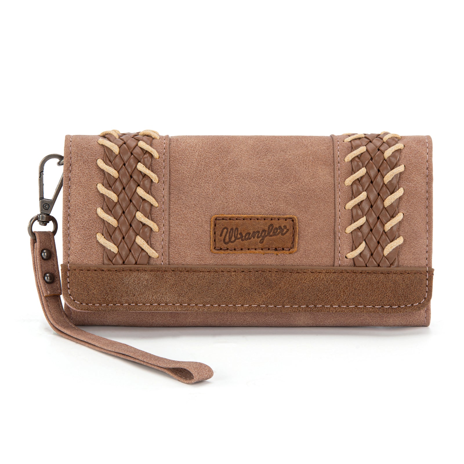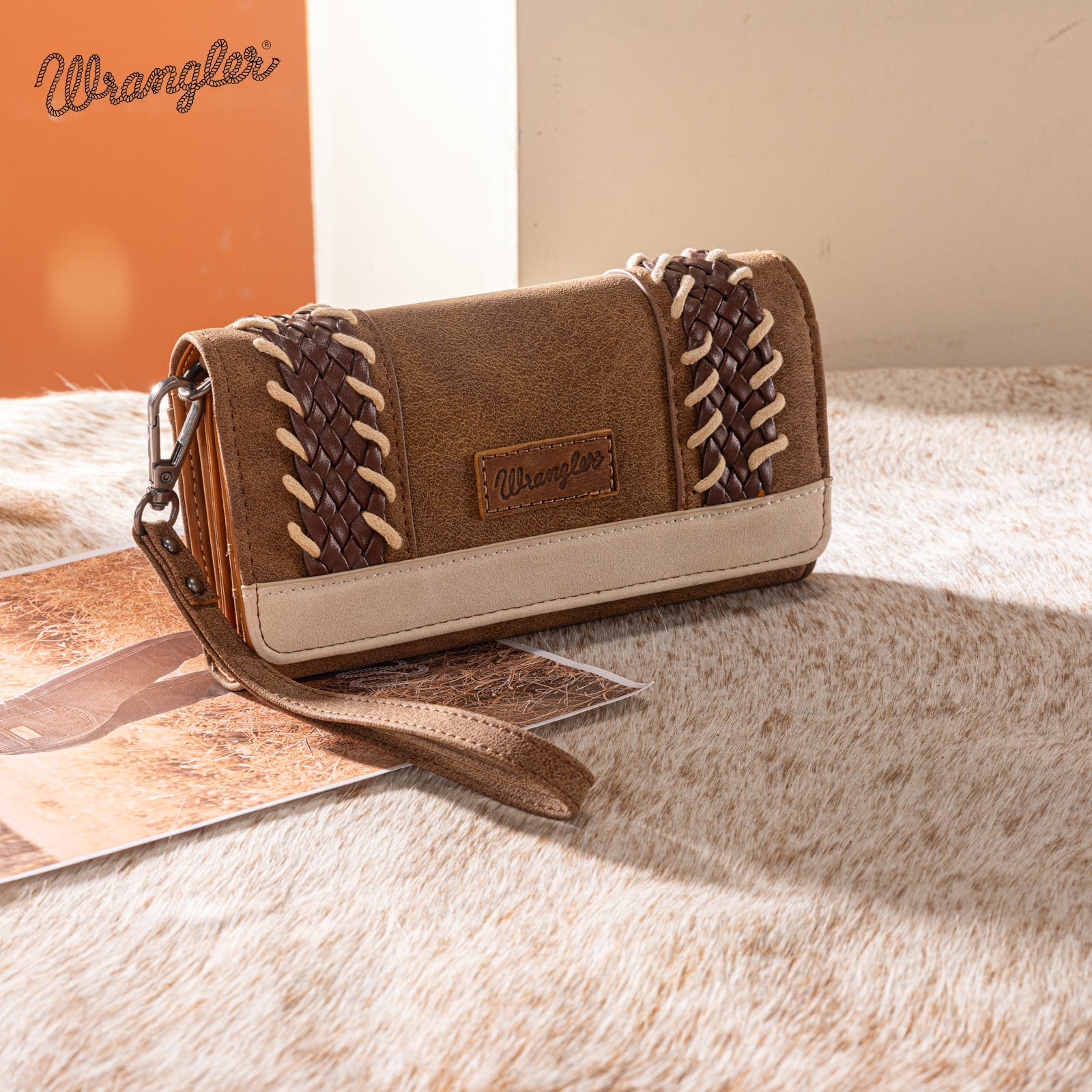 SKU:WG217-C018BGClassic western style meets everyday function. This Wrangler wristlet wallet features beautifully braided faux leather panels with whipstitch details for a timeless, rustic look.