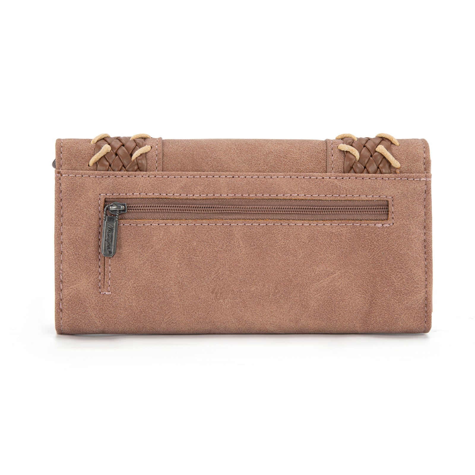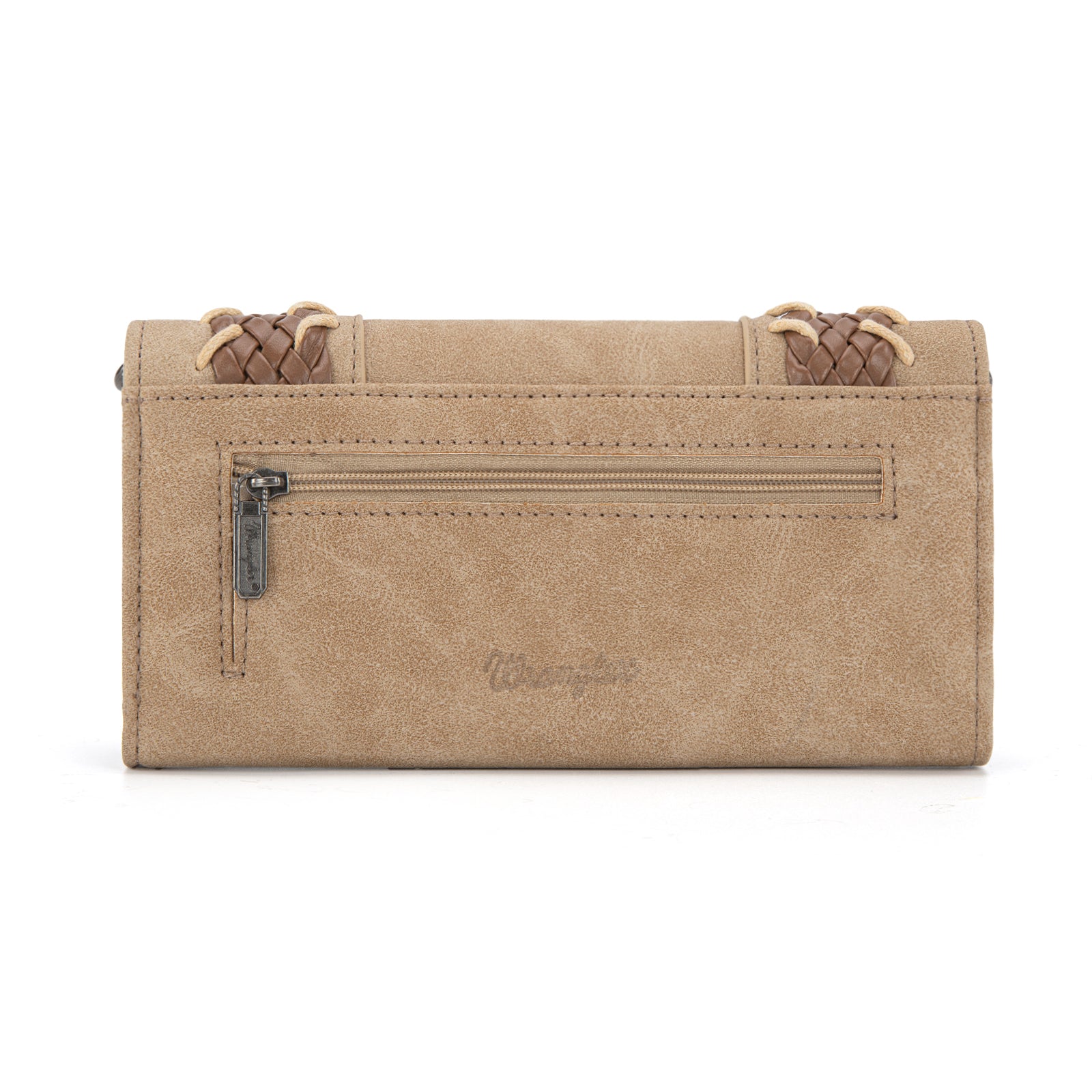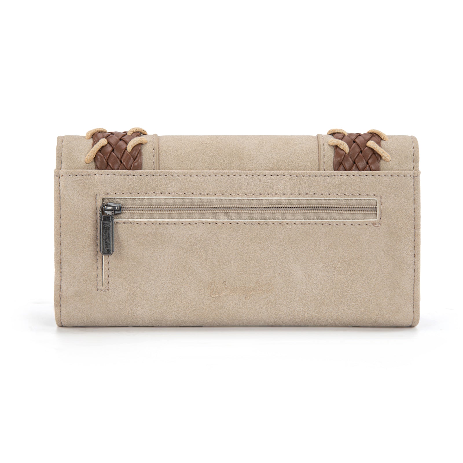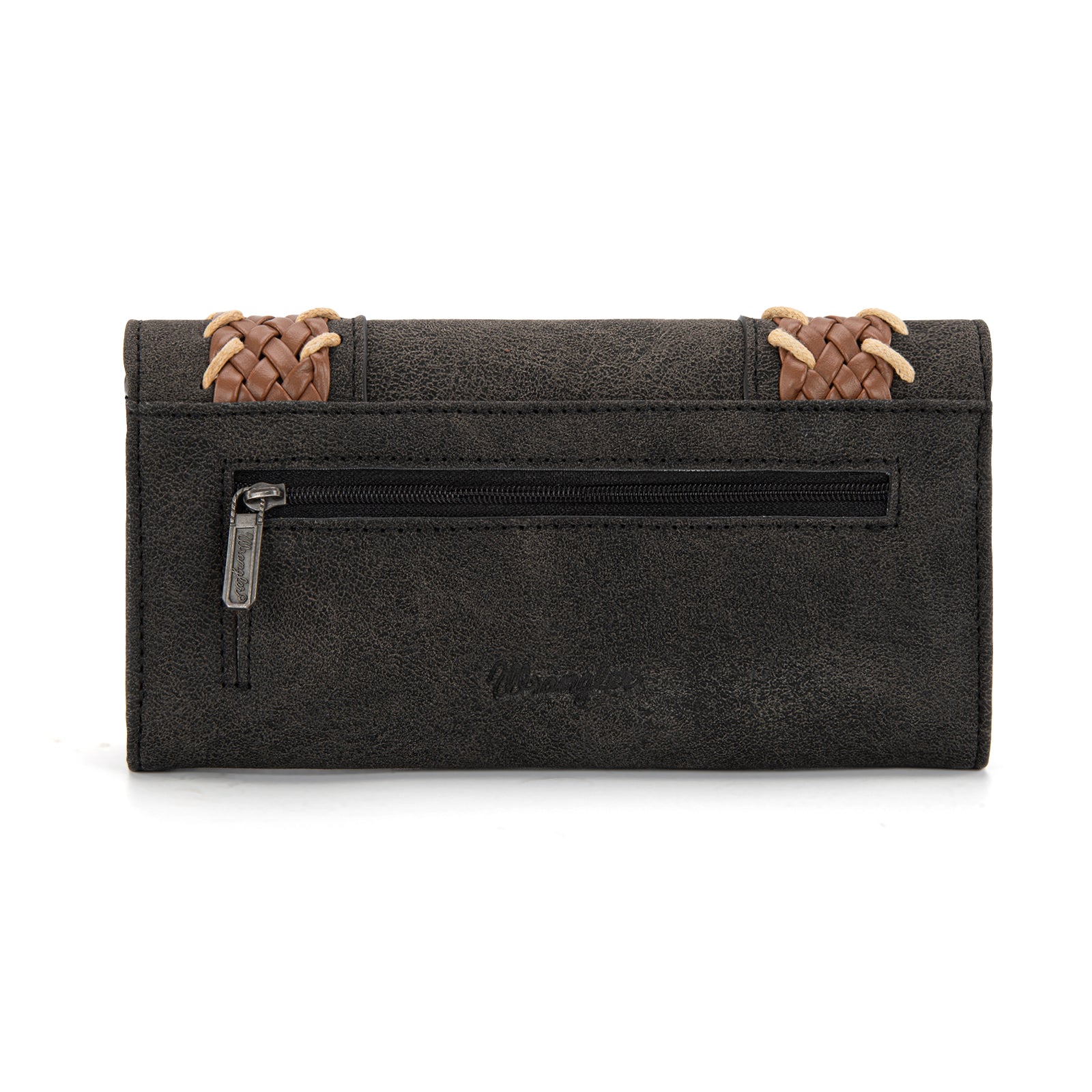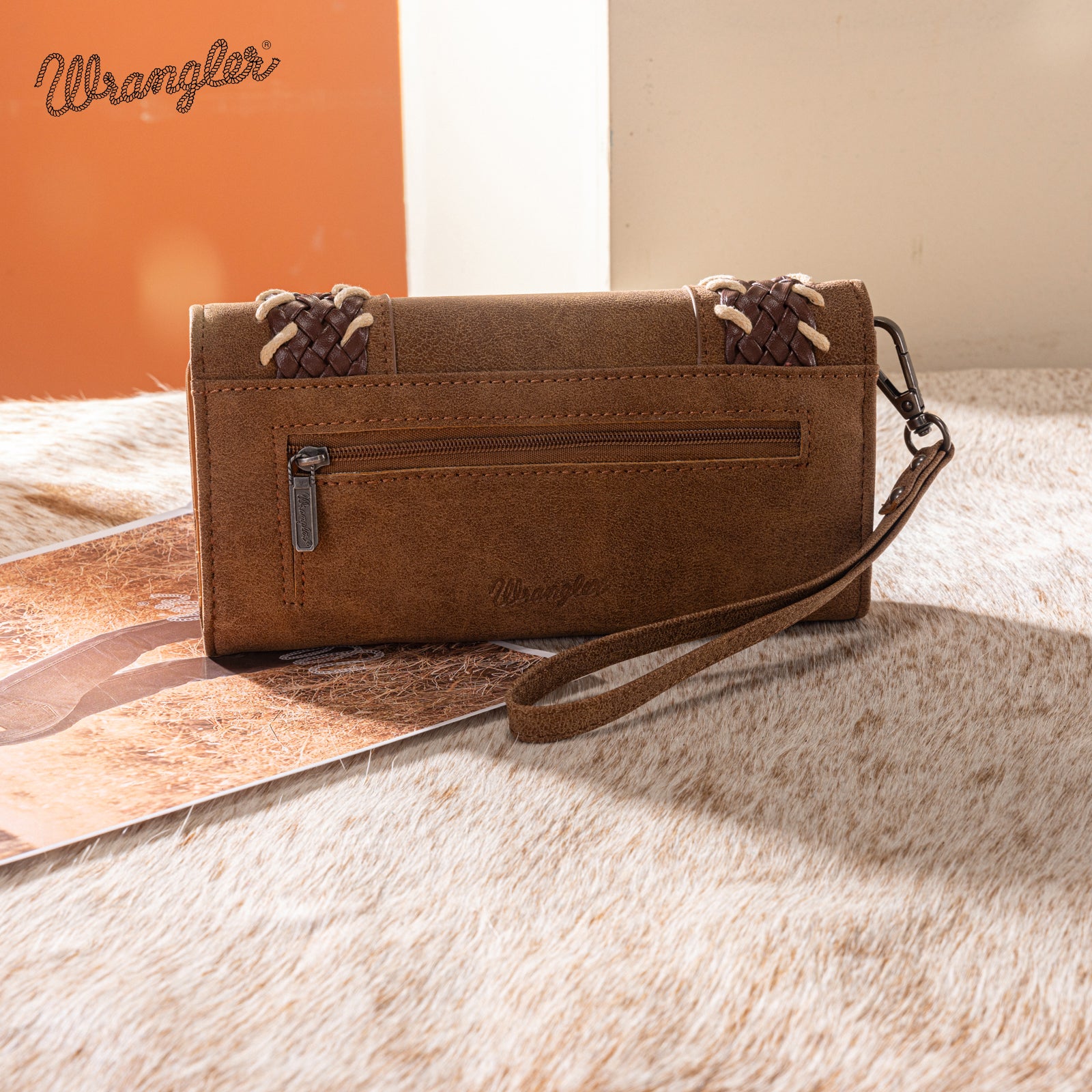 SKU:WG217-C018BGClassic western style meets everyday function. This Wrangler wristlet wallet features beautifully braided faux leather panels with whipstitch details for a timeless, rustic look.