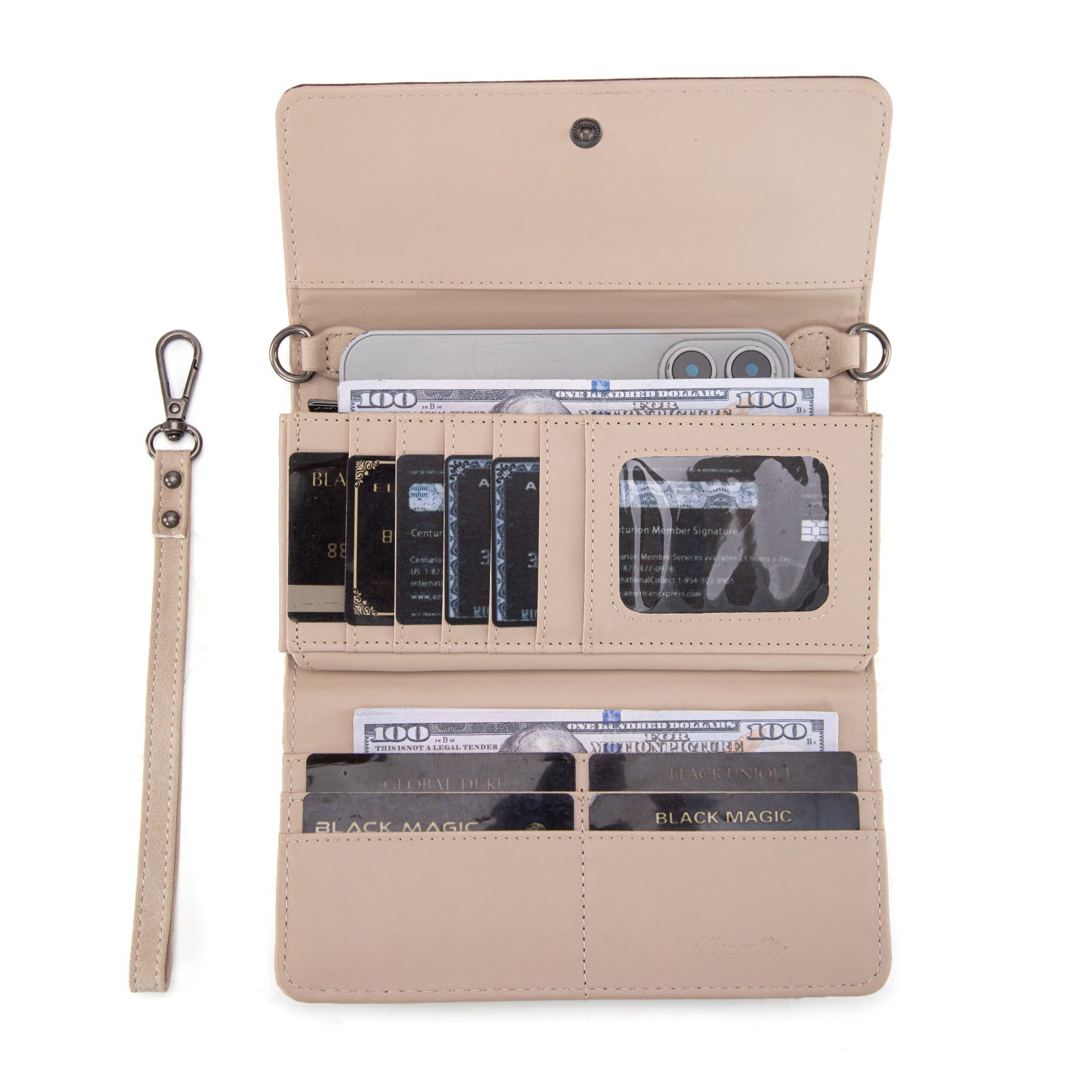 Made of PU leather , this wallet/wristlet/crossbody bag has:-