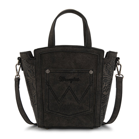 Made of PU leather,(suede-like) this tote/crossbody has: Genuine Hair-on cowhide Wrangler logo applique on the front Floral embossed on sides Top zipper closure Inside of the bag includes a...