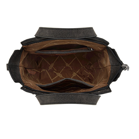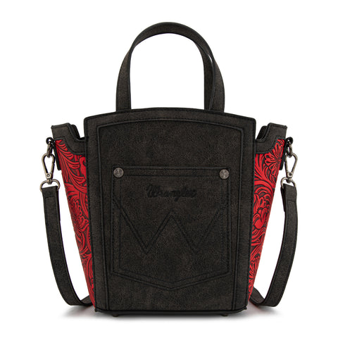 Made of PU leather, this tote/crossbody has: Genuine Hair-on cowhide Wrangler logo applique on the front Floral embossed on sides Top zipper closure Inside of the bag includes a...