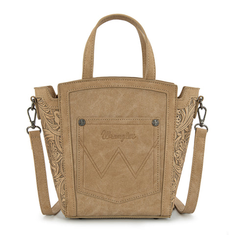 Made of PU leather, this tote/crossbody has: Genuine Hair-on cowhide Wrangler logo applique on the front Floral embossed on sides Top zipper closure Inside of the bag includes a...