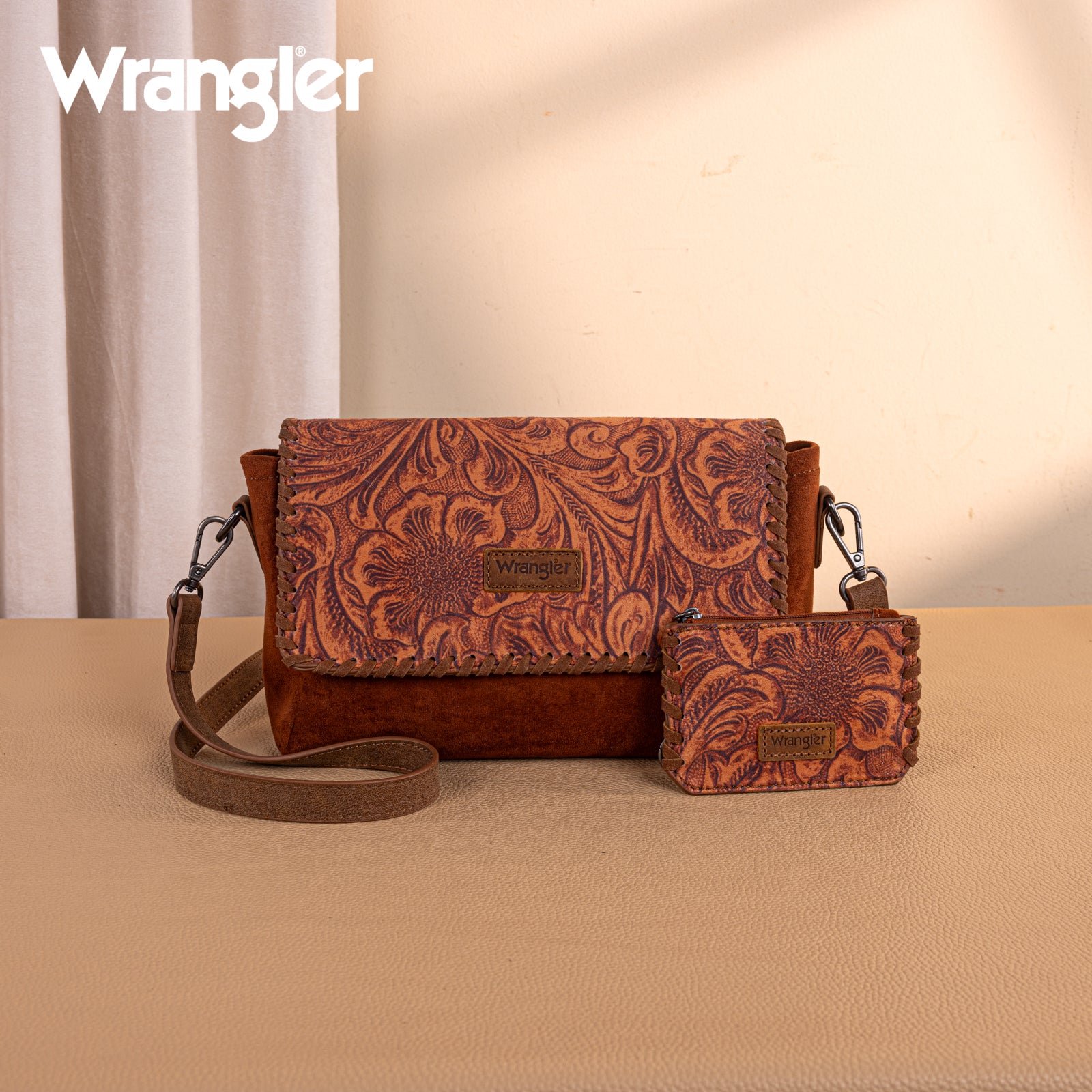 WG277-236BR Wrangler Vintage Floral Printed Crossbody Bag with Small Pouch- Brown