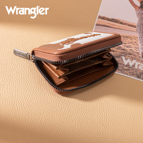 Made of PU leather , this wallet has:- Cow print front and back Wrangler logo embroidered  on the front Zipper closure 5 open compartments 4.5" x 0.6" X  3"