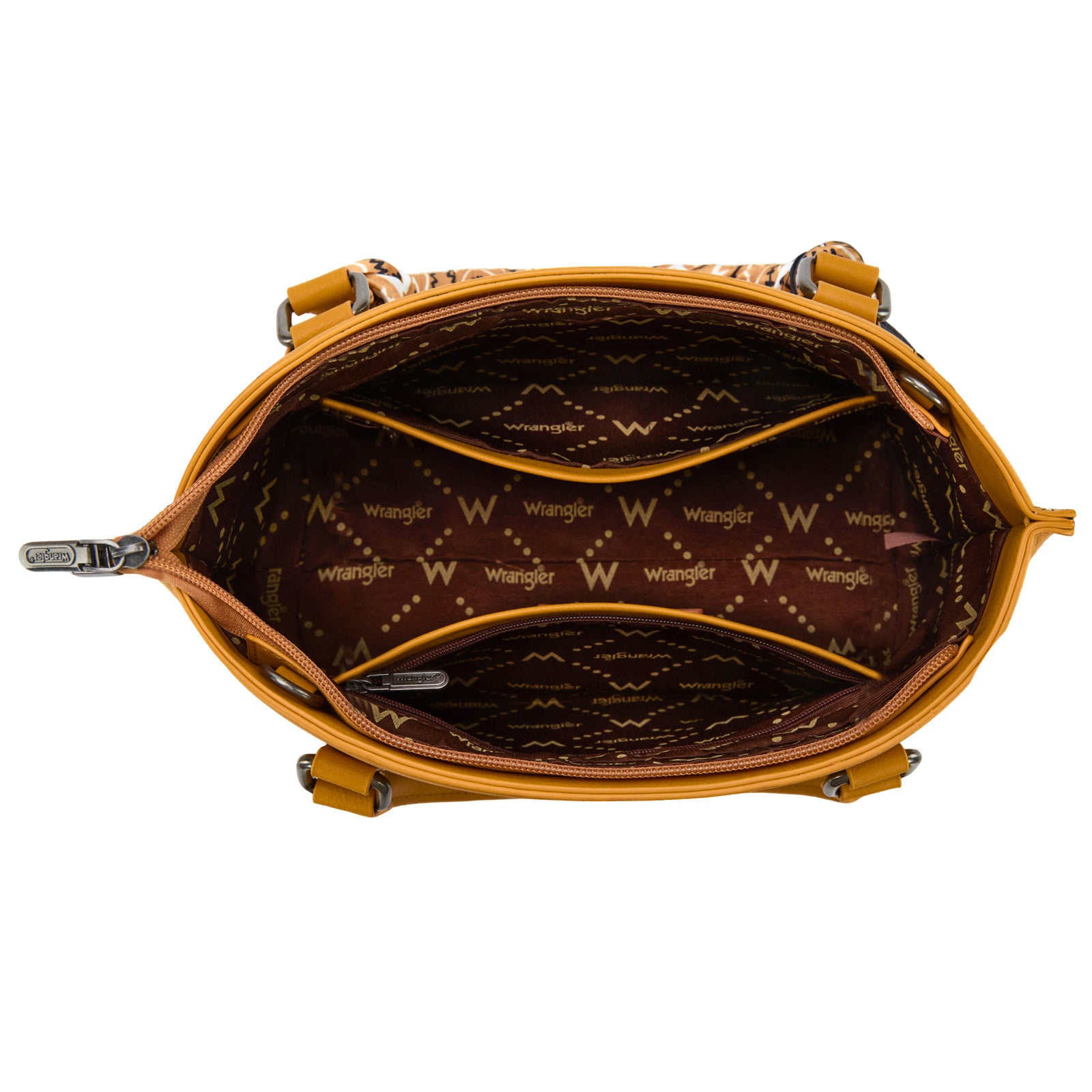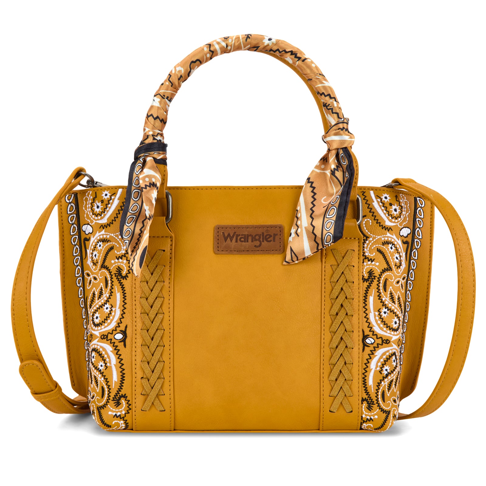 SKU:WG331-2005YLCrafted from durable PU leather, this bandana hand-tie handle tote combines western charm with everyday functionality. Featuring an embroidered paisley accented with whipstitch details, it’s finished with a Wrangler® logo applique on the front for a signature touch.