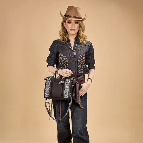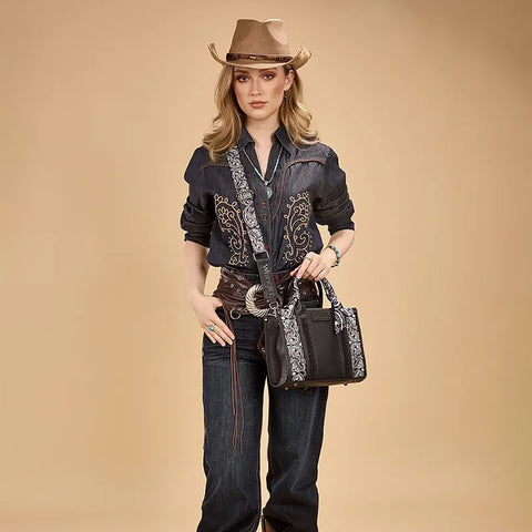 Crafted from durable PU leather, this bandana hand-tie handle tote combines western charm with everyday functionality. Featuring an embroidered paisley accented with whipstitch details, it’s finished with a Wrangler® logo...