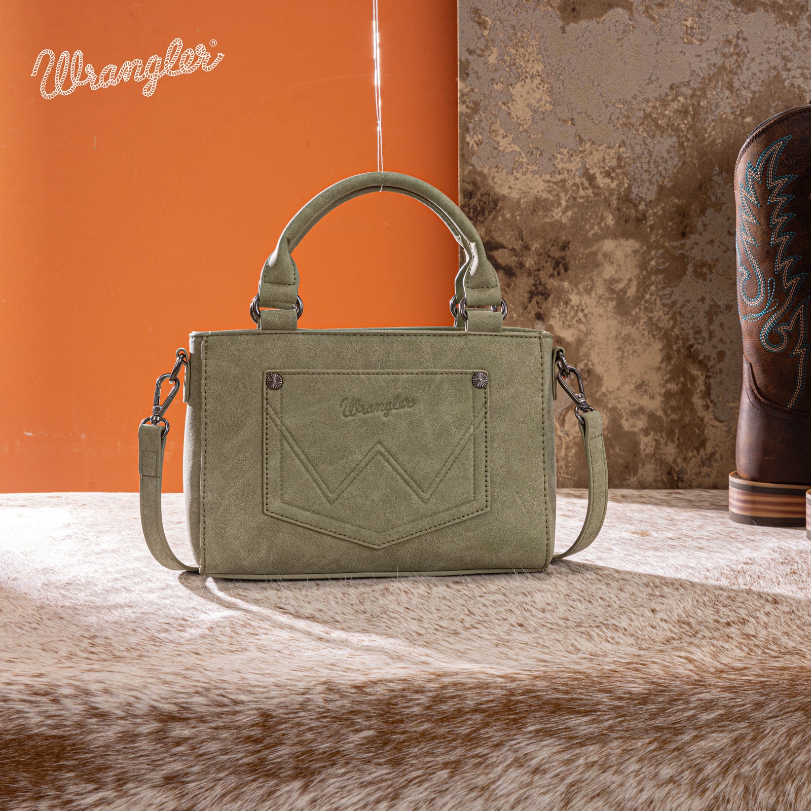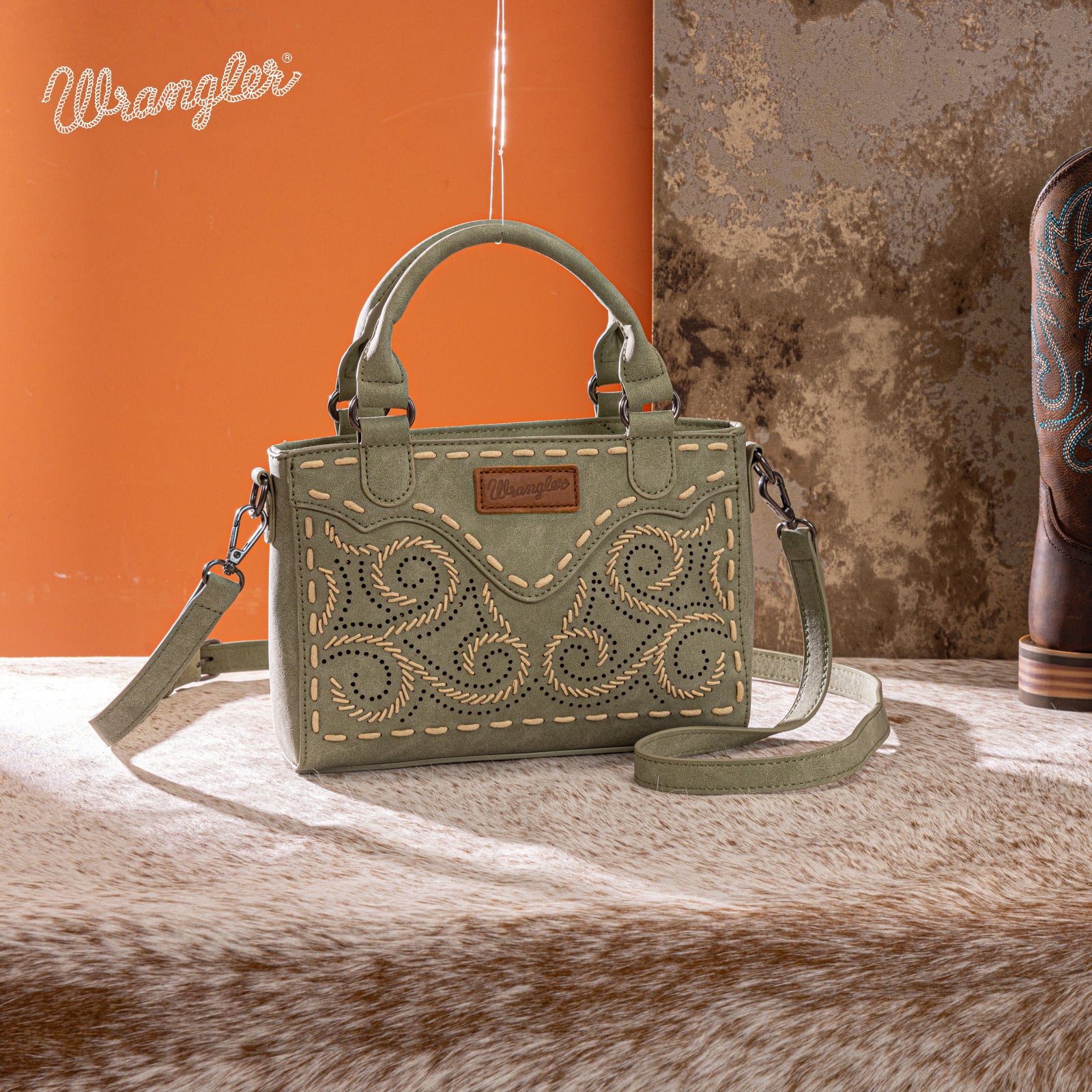 SKU:WG337-2003GNAdd a touch of Western charm to your everyday look with this beautifully crafted Wrangler mini satchel. Designed with intricate embroidered swirl detailing and contrast whipstitch accents, this bag blends rustic character with modern functionality.