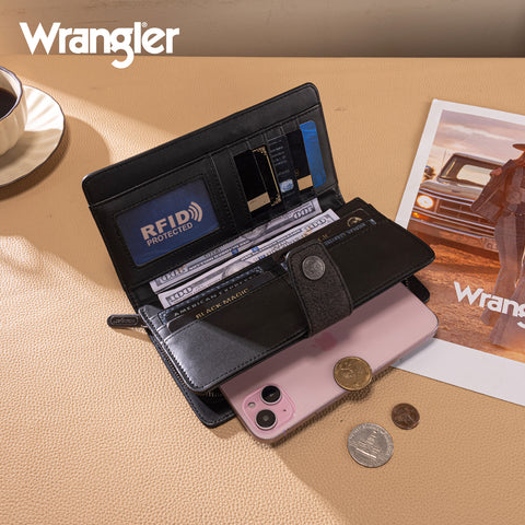 Made of PU leather , this wallet has:- Floral tooled on the front pocket Wrangler logo on the front Flap with magnetic button closure RFID Protected Interior features 10...