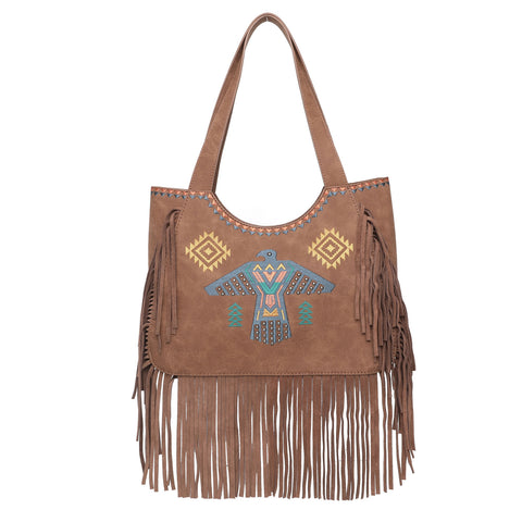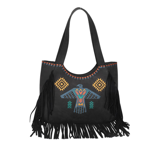 Wrangler by Montana West, Fringe Western tote Made of PU Leather, this tote has:- Embroidered thunderbird aztec design Antique silver embellishments Fringe detail Top zipper closure Inside single compartment divided...