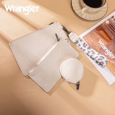 This detachable 3 pouch wristlet features 2 square wallet and a round case (earbud holder) and a wristlet Made of PU leather the wristlet wallets have:- Leopard print Wrangler logo...