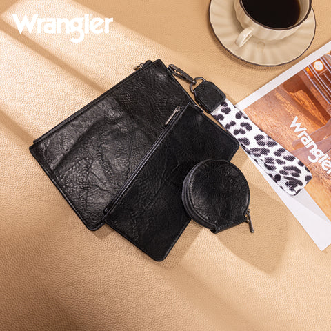 This detachable 3 pouch wristlet features 2 square wallet and a round case (earbud holder) and a wristlet Made of PU leather the wristlet wallets have:- Leopard print Wrangler logo...