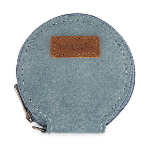 This detachable 3 pouch wristlet features 2 square wallet and a round case (earbud holder) and a wristlet Made of PU leather the wristlet wallets have:- Leopard print Wrangler logo...