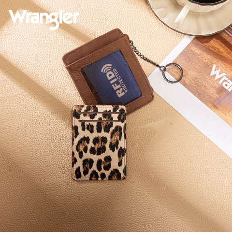 Made of PU leather , this wallet has:- Leopard print Wrangler logo on the front Detachable card case Zip closure RFID Protected ID clear slots on the back 3.75"...