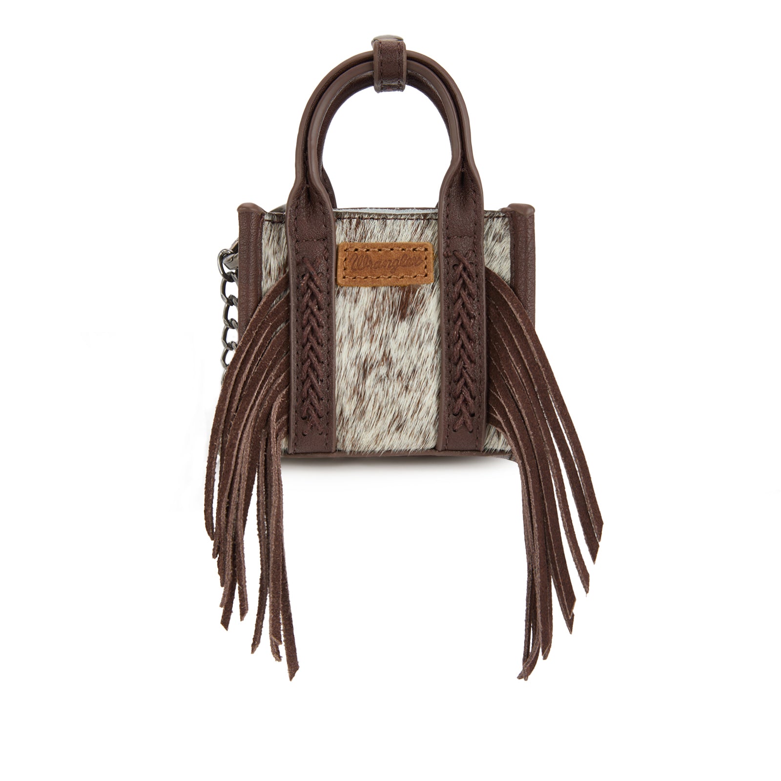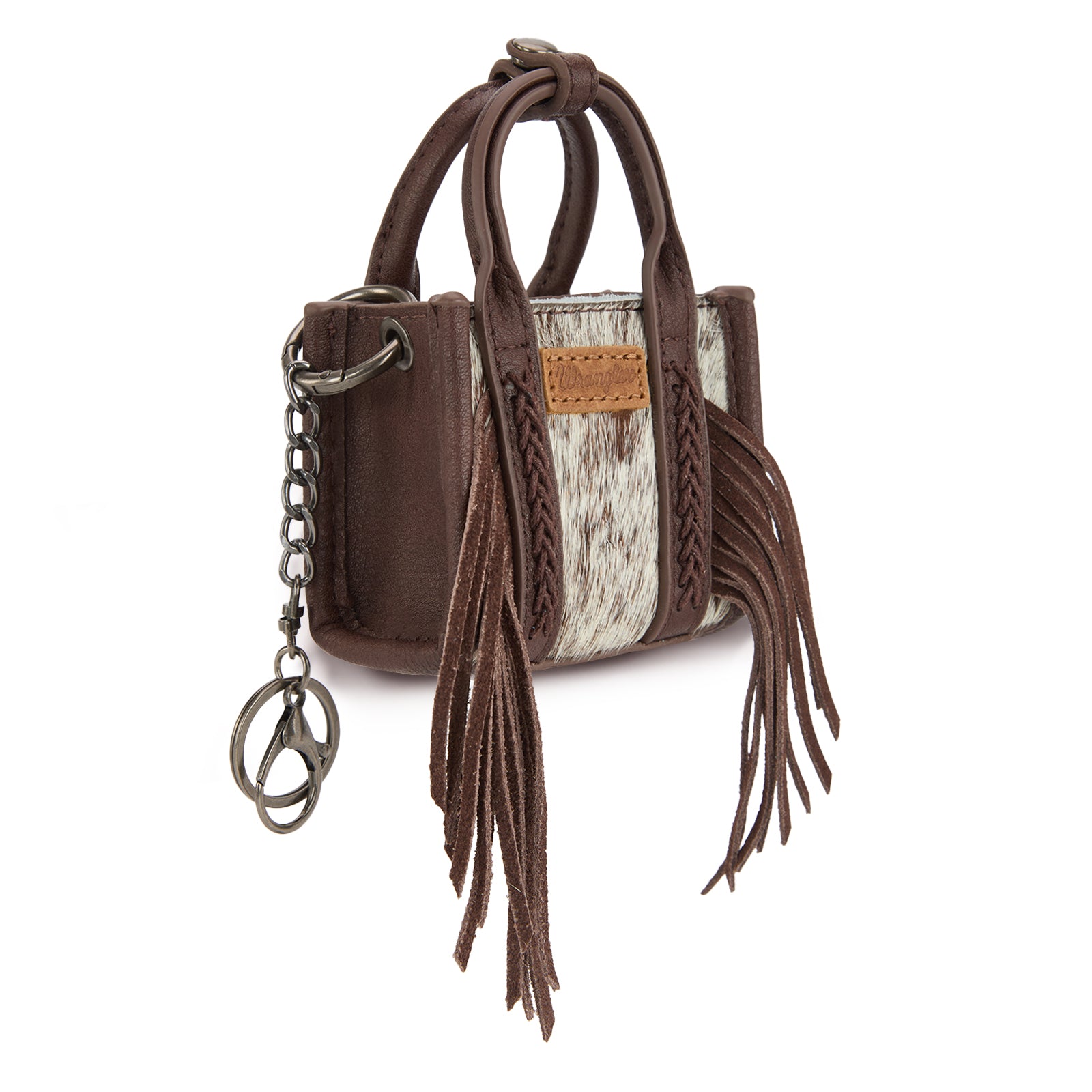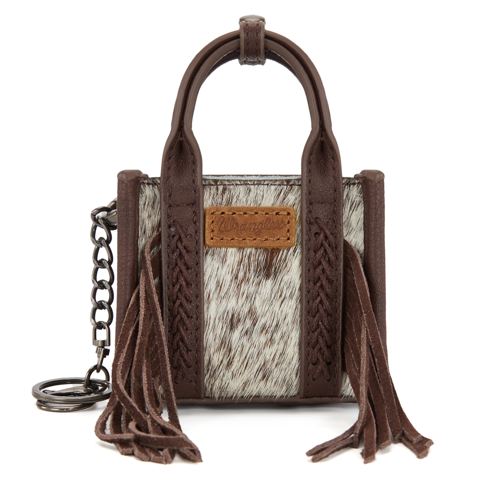 Add a touch of Western charm to your everyday essentials with this adorable Wrangler mini tote. Designed with genuine cowhide hair-on front panels and soft PU leather trim, this compact bag features braided handle details and flowing fringe for a stylish rustic look. Perfect as a mini tote, bag charm, or keychain accessory.