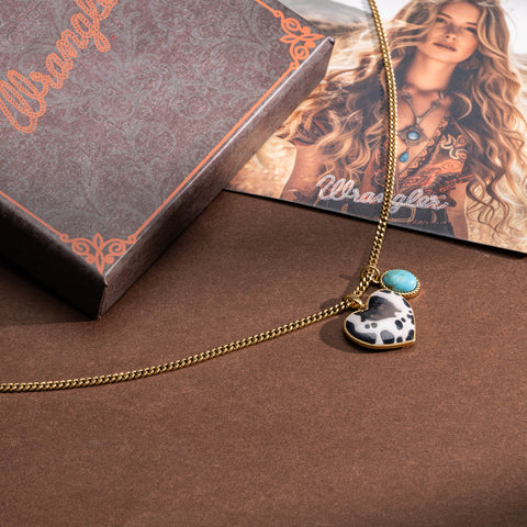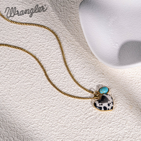 WNS2-1129G Wrangler Cow-Print Natural Stone Pendant Gold Necklace Earrings Set - Turquoise